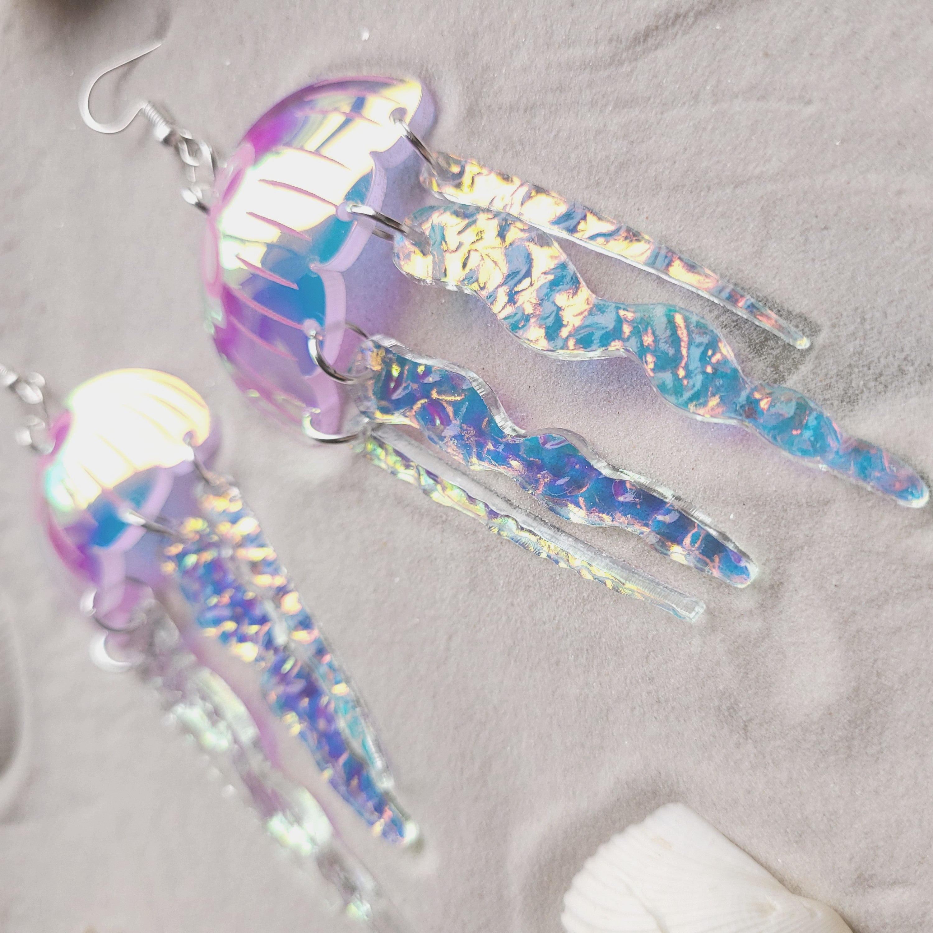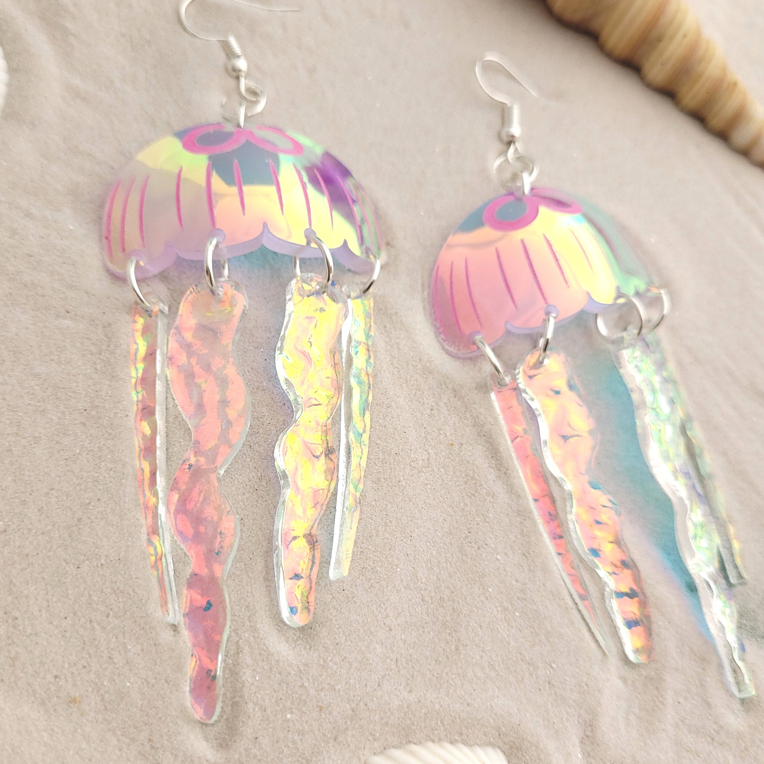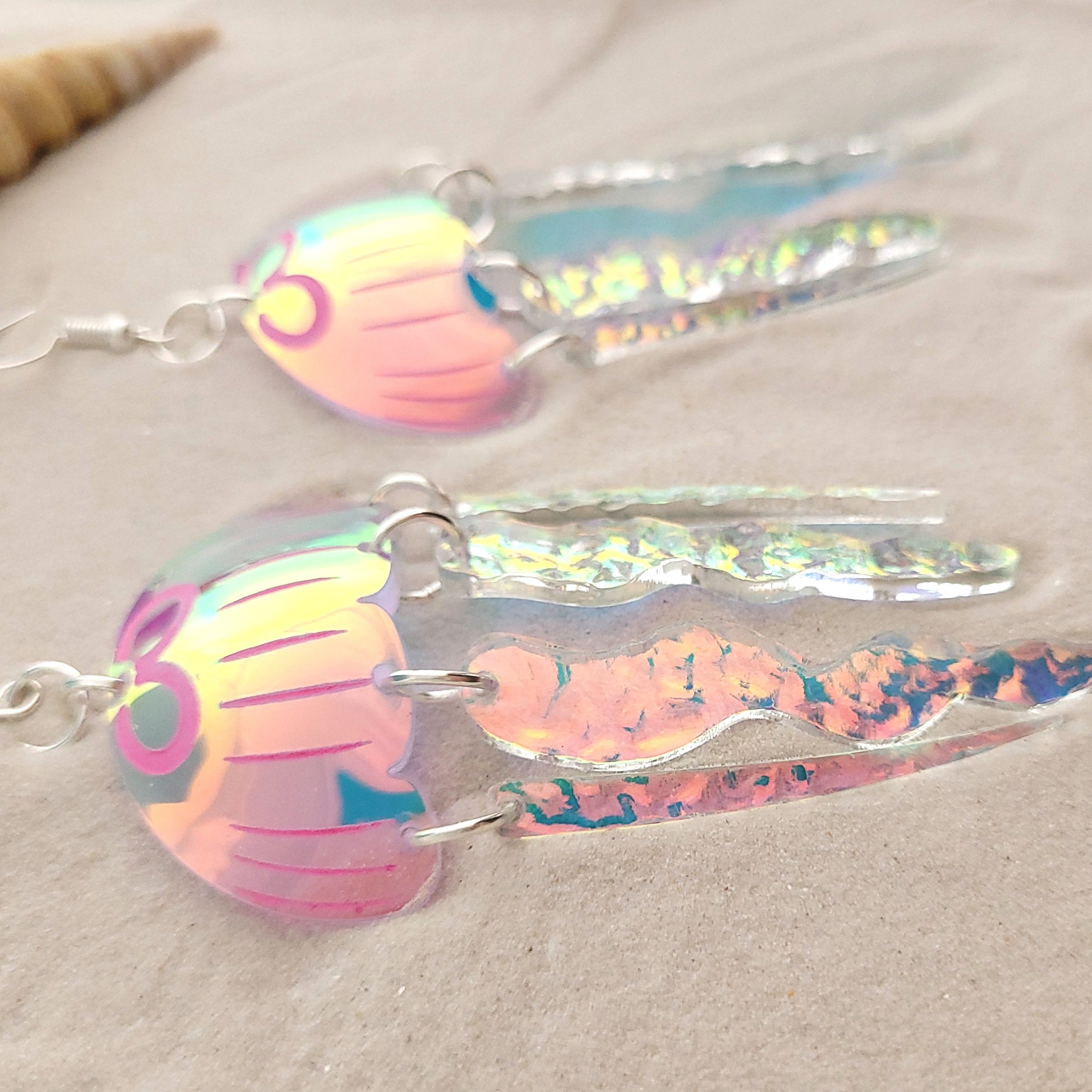 They're laser cut from iridescent acrylic pieces, hand-inked with pink detail to resemble a moon jellyfish, and strung from plated earring wires. Each one measures approximately 80mm tall and features heat-bending and hanging charms for dynamic movement!