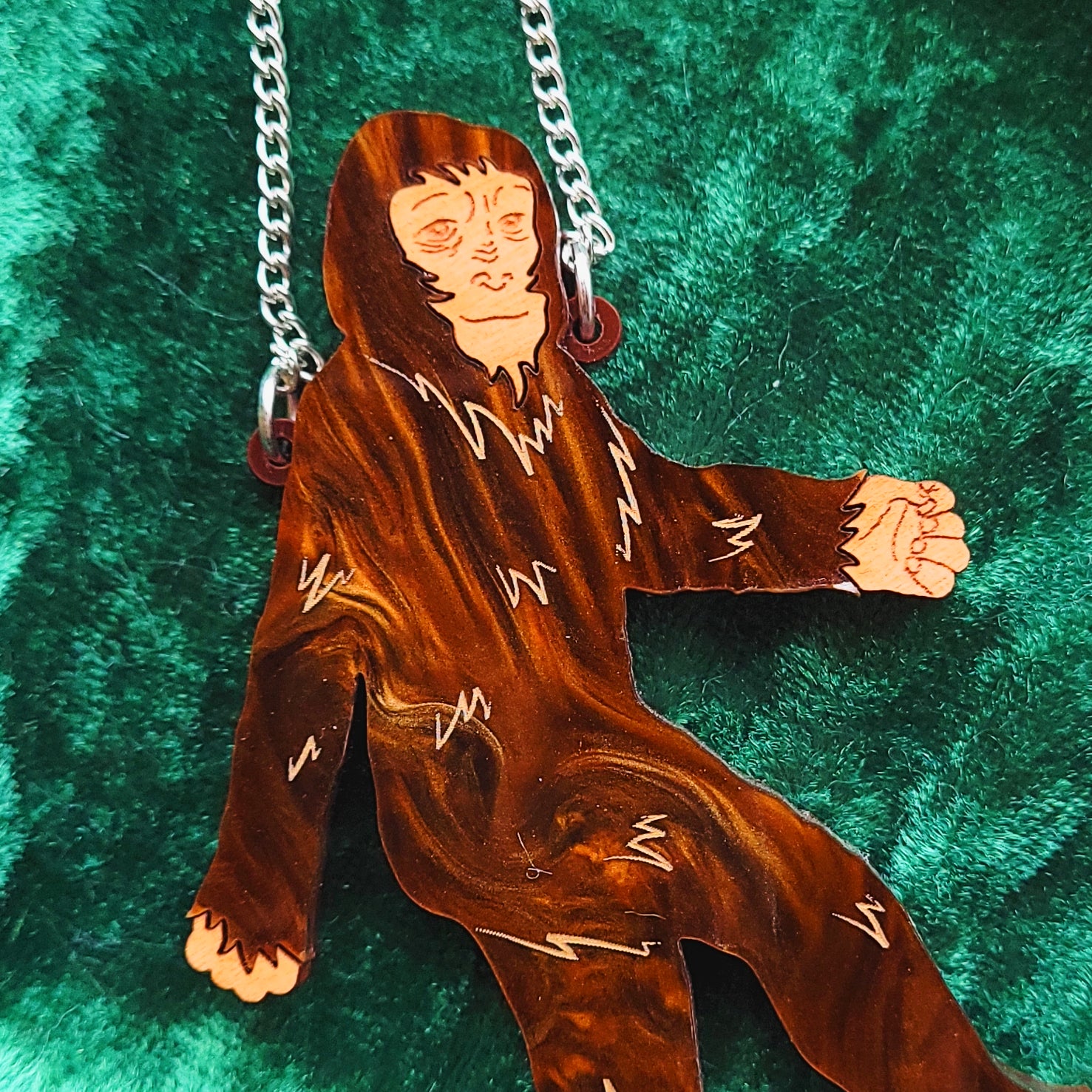 This handsome hirsute humanoid stands at 88mm tall and we've laser cut him from premium marbled acrylic and wooden pieces that are then hand assembled and strung from a plated chain of your choice!