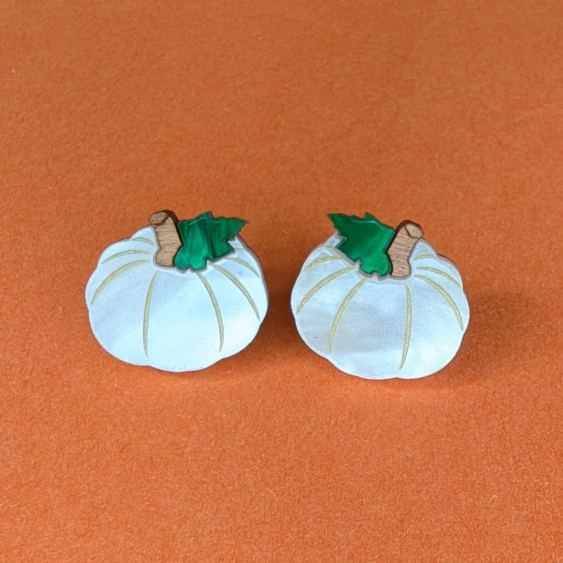 A pair of 20mm wide laser cut acrylic and wood white pumpkin charms with gold plated earring backs.