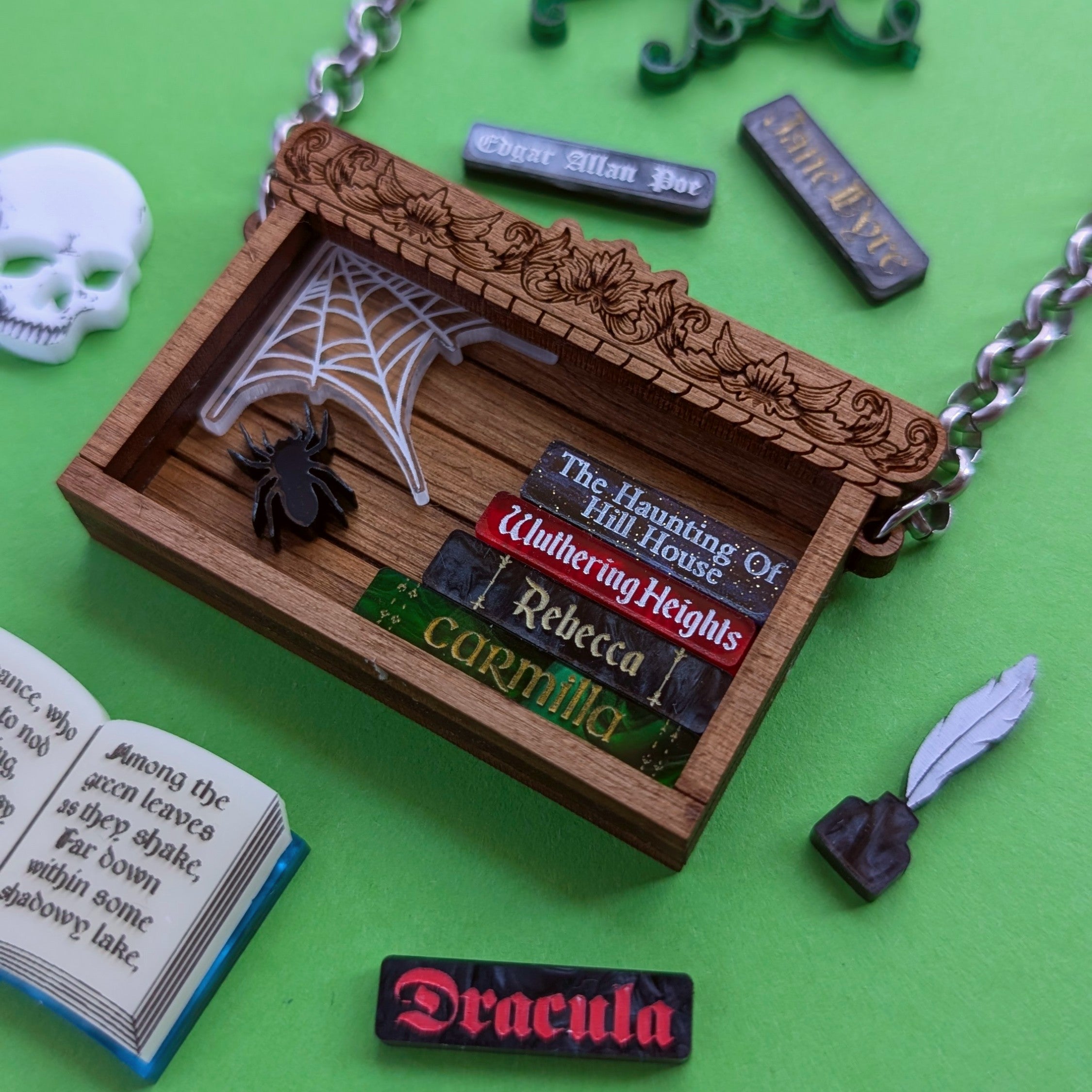 Celebrate dark academia with our detailed individual book shelf necklace. Measuring 64mm wide, it is crafted from solid walnut wood and premium acrylic, then finished and assembled by hand.