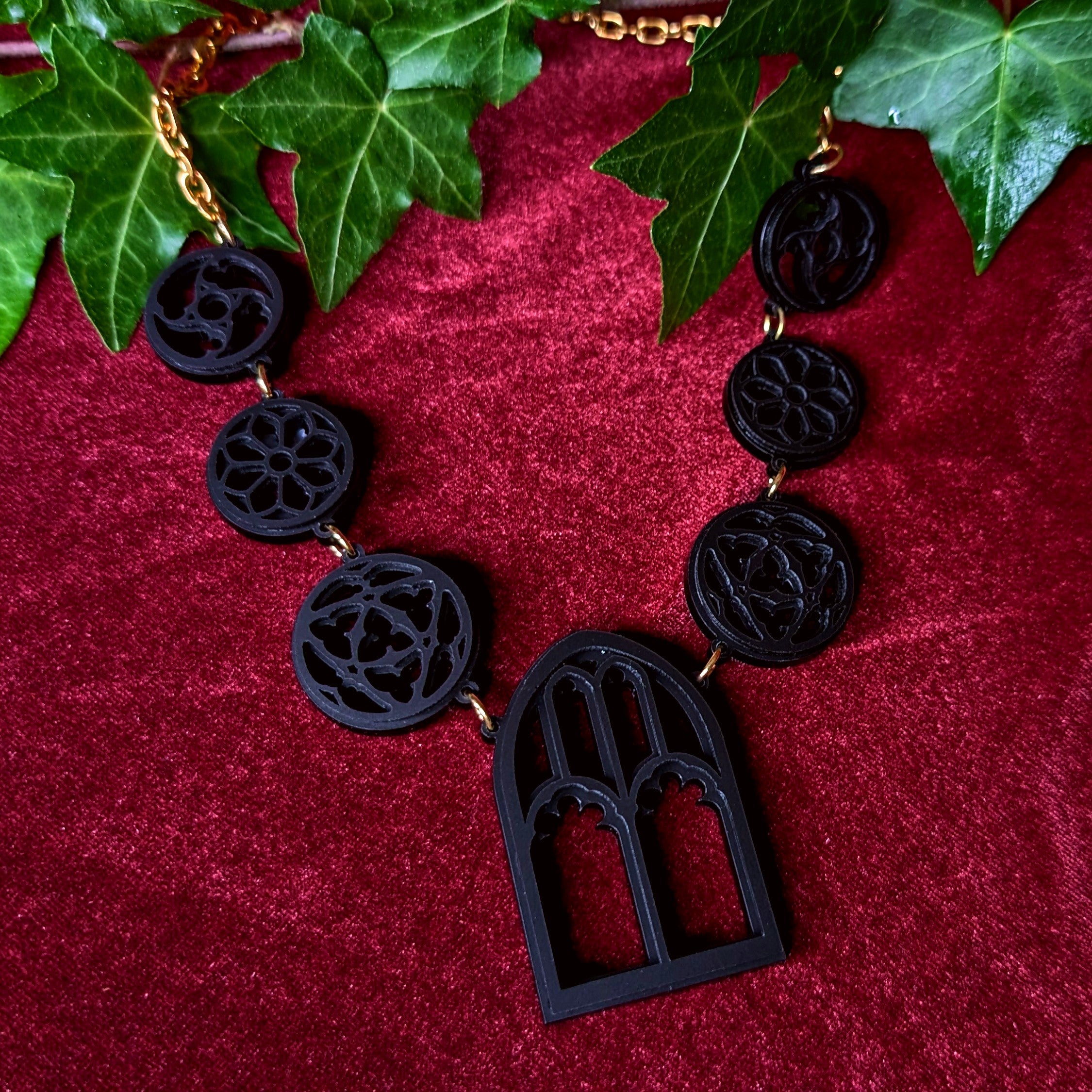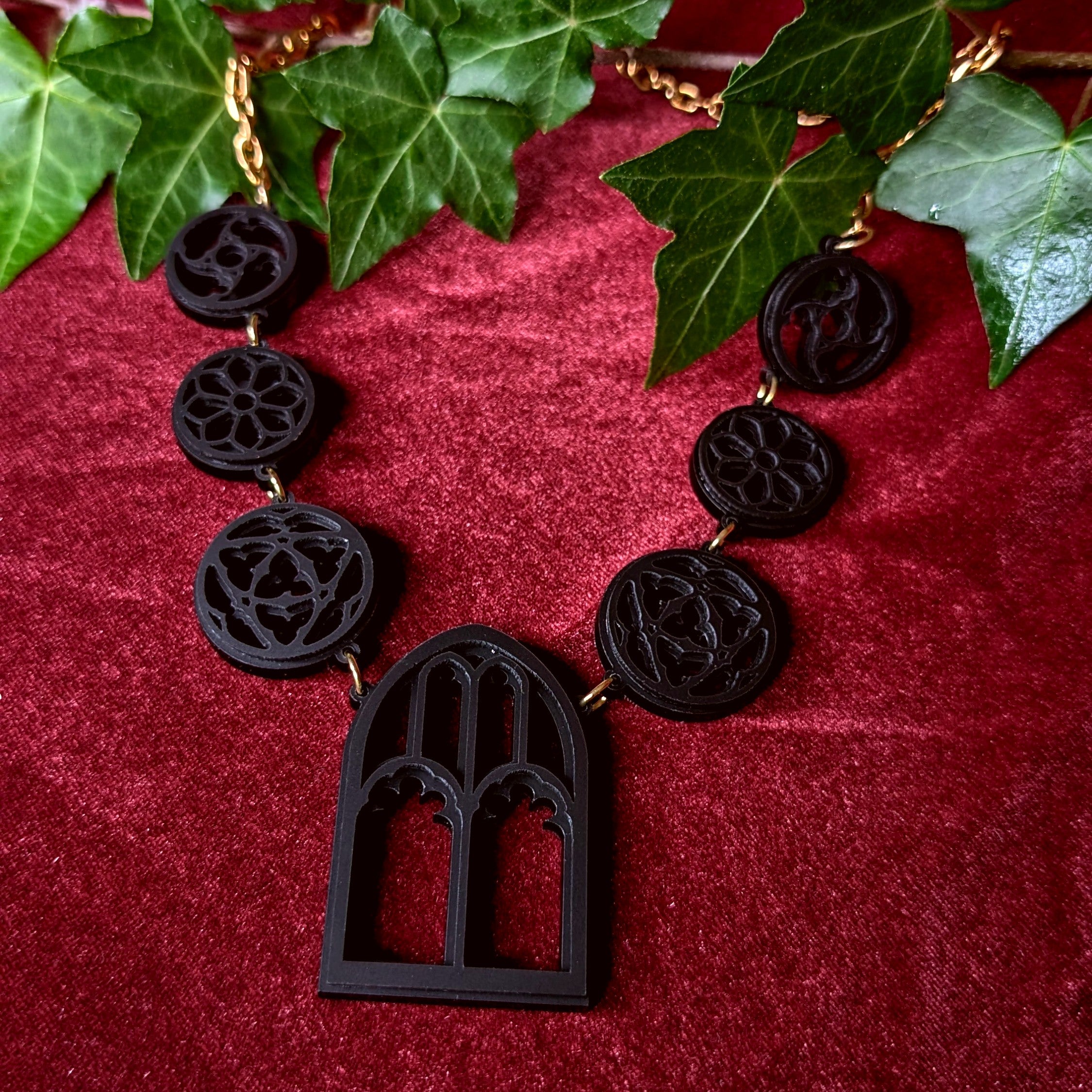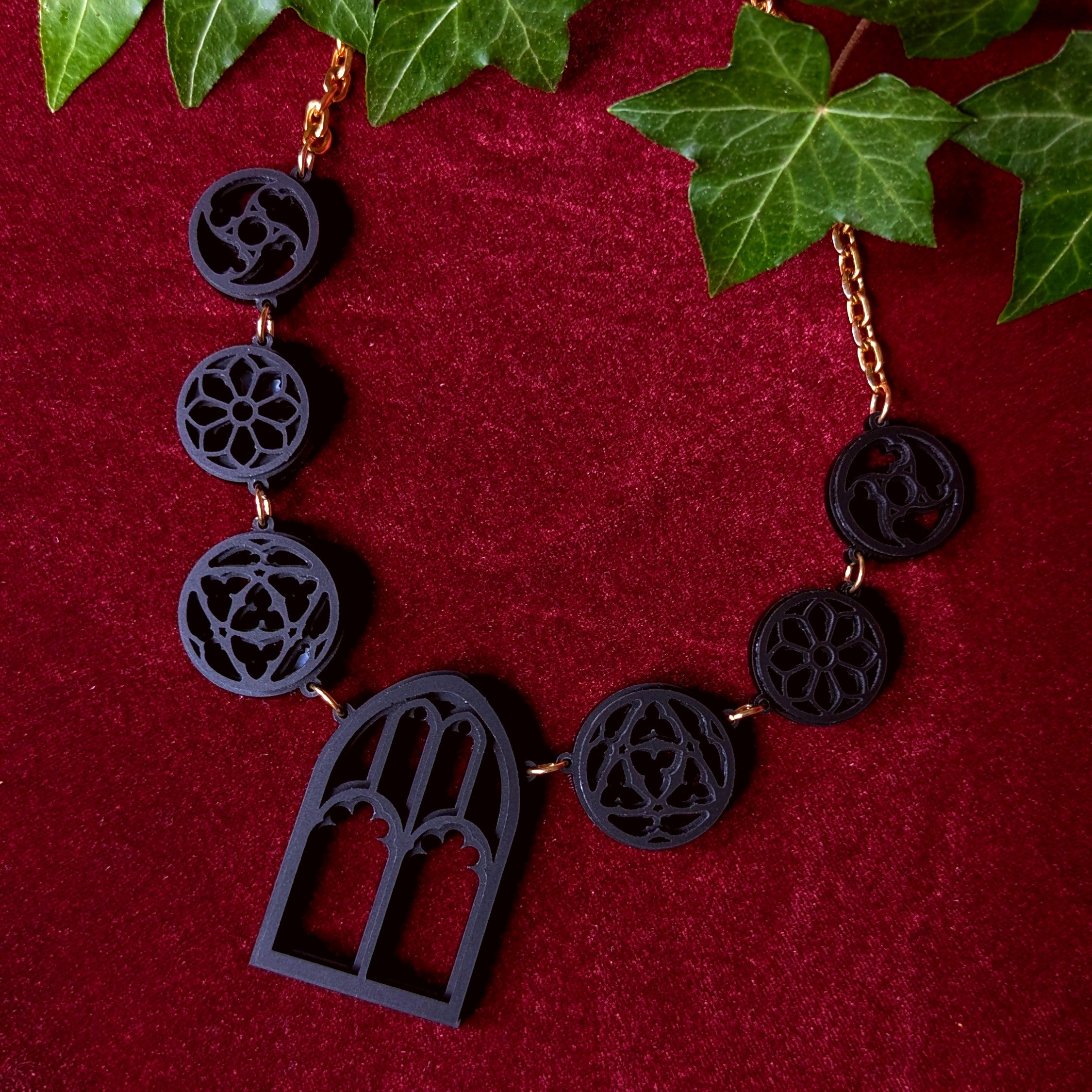 Our gothic windows statement necklace celebrates the timeless beauty of gothic architecture. Measuring an impressive 200mm across, it is assembled from layered matte black laser cut acrylic.