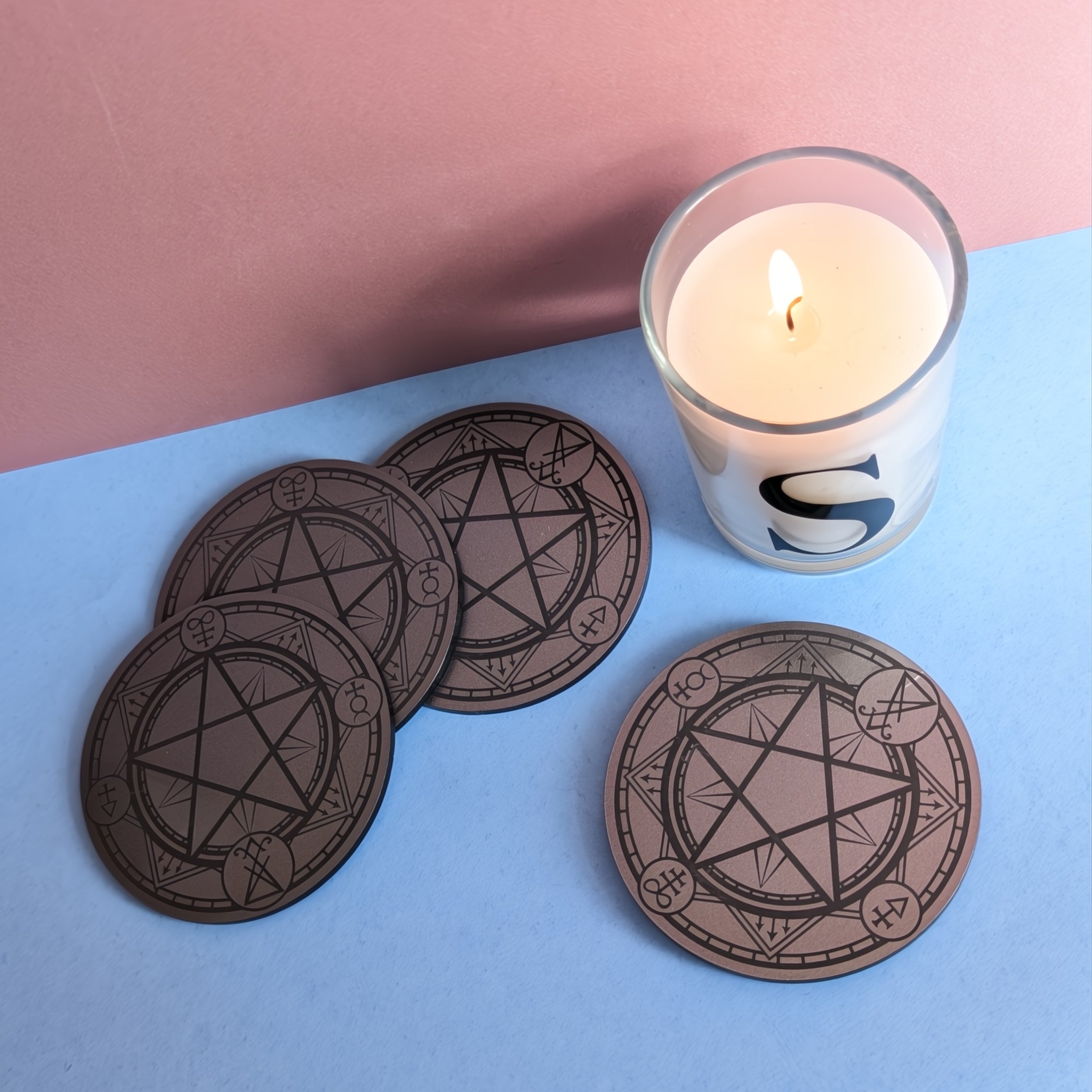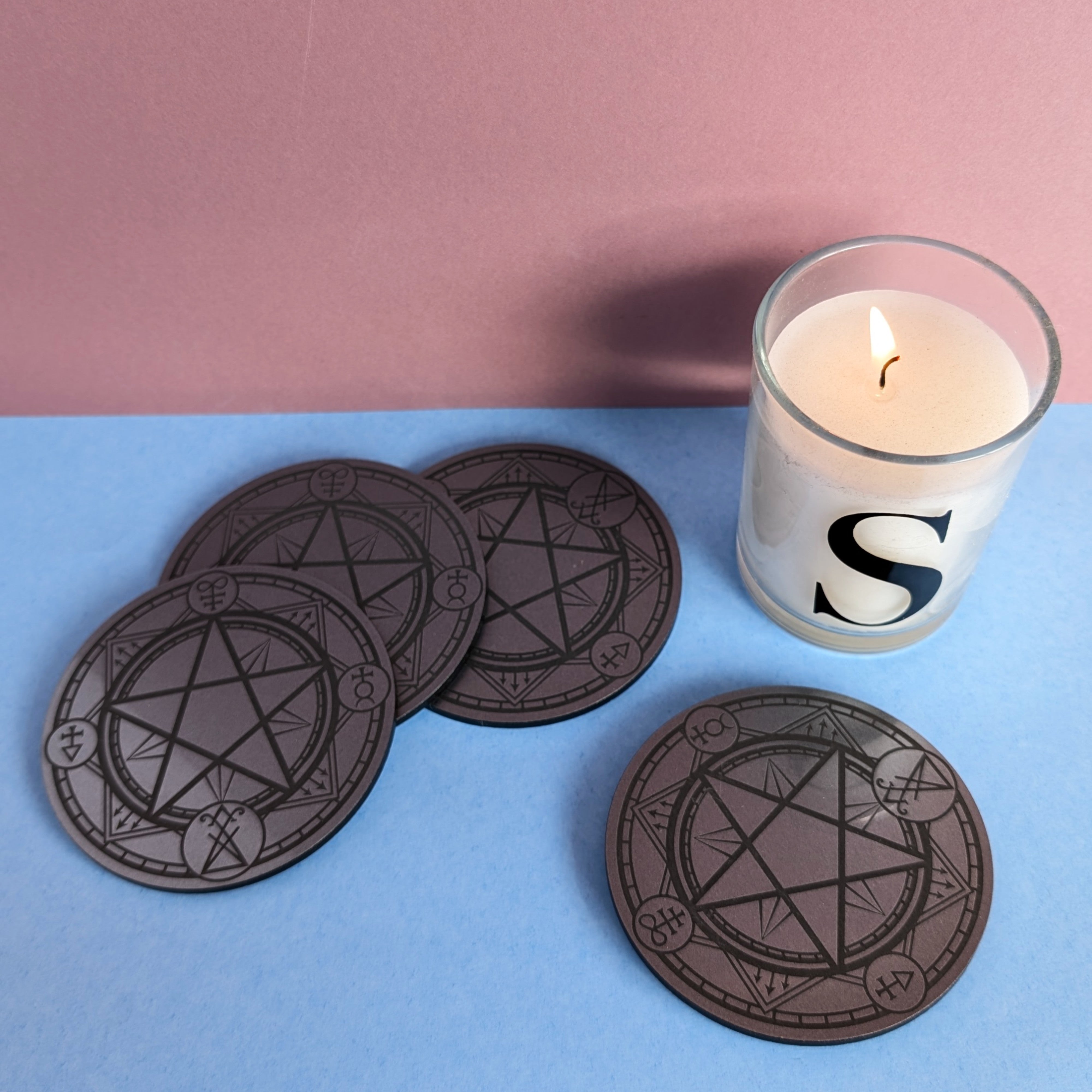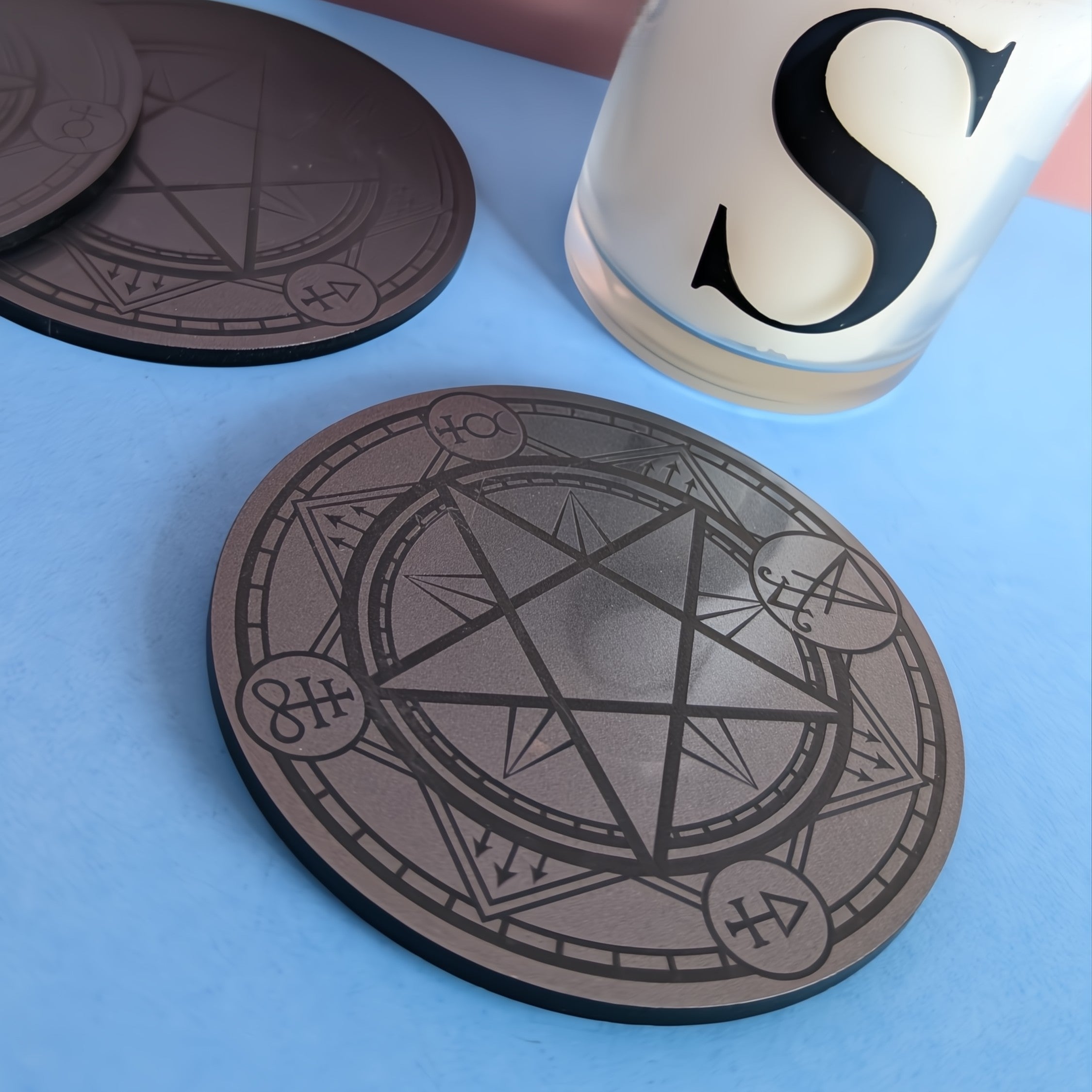 These drinks coasters are laser cut from, and engraved in, a silver and black acrylic. Each one measures 85mm wide and has three soft plastic cushion tabs underneath, to stop them scratching your surfaces. This listing is for a set of four.