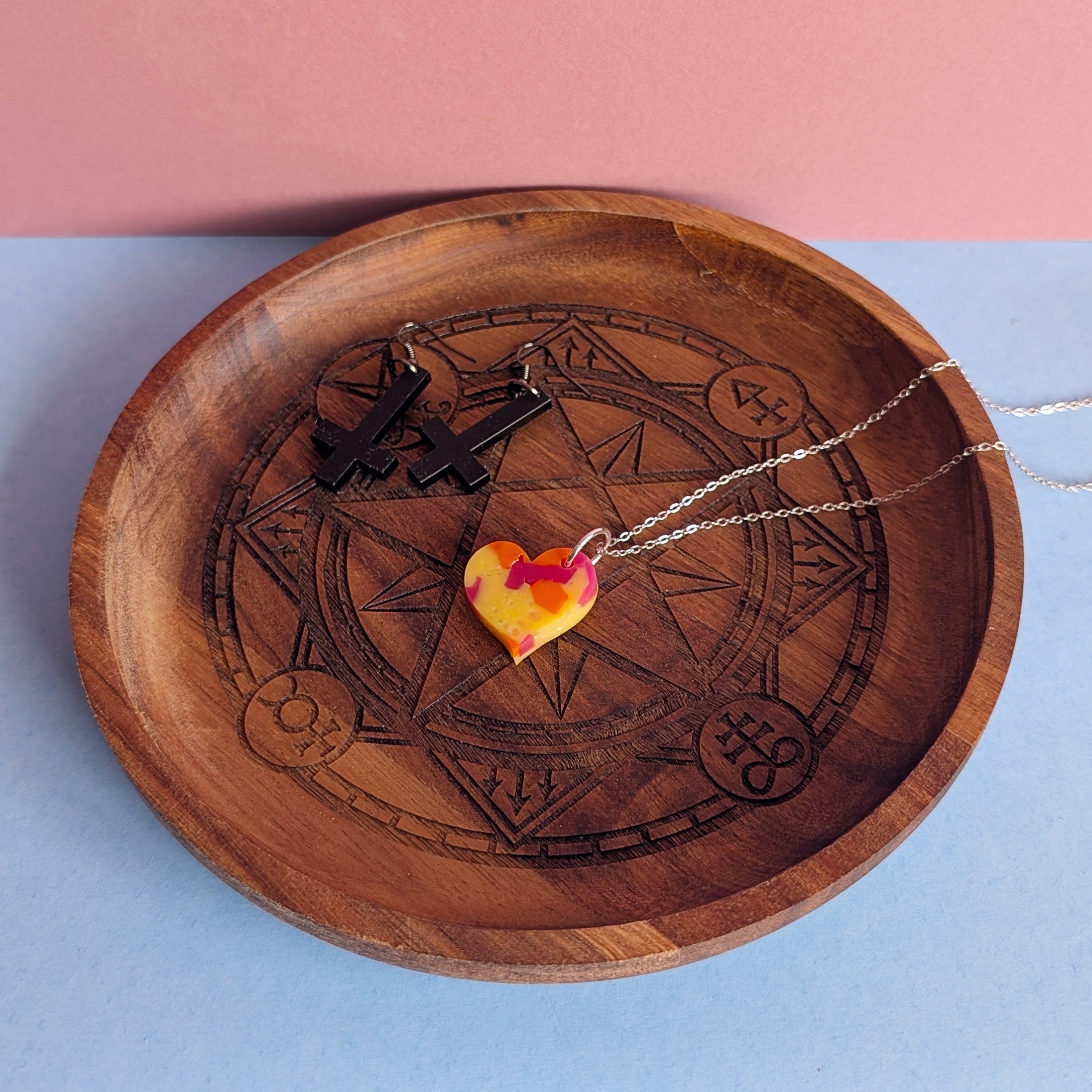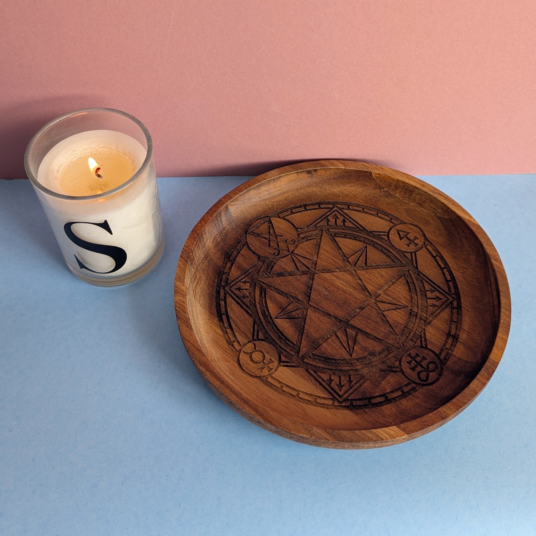 This dish is made from engraved acacia wood and features a summoning circle design. It measures approximately 180mm wide.