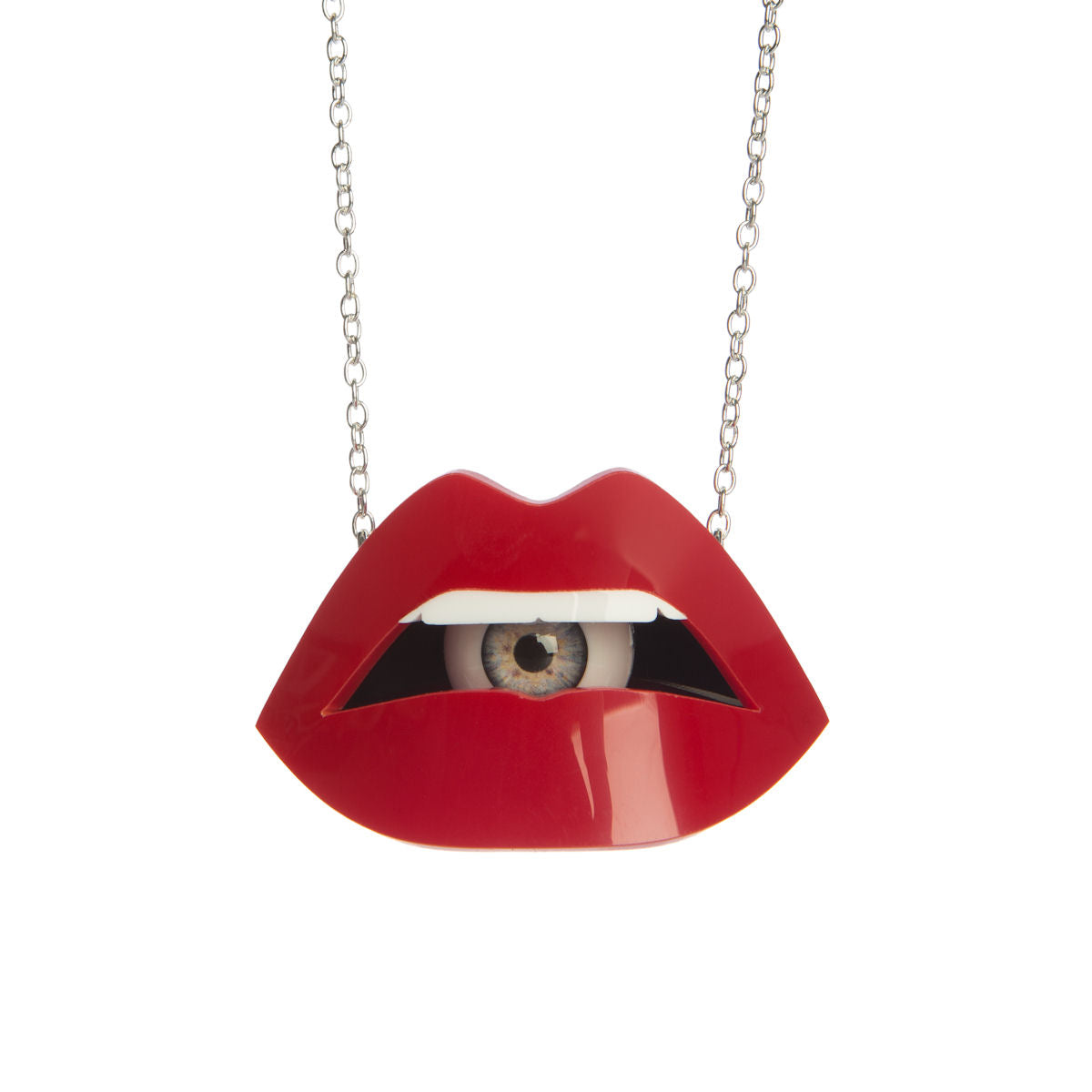 This necklace is made from two layers of laser cut acrylic, curved around a realistic looking dolls eye and strung from a plated chain. The pendant measures 58mm wide.