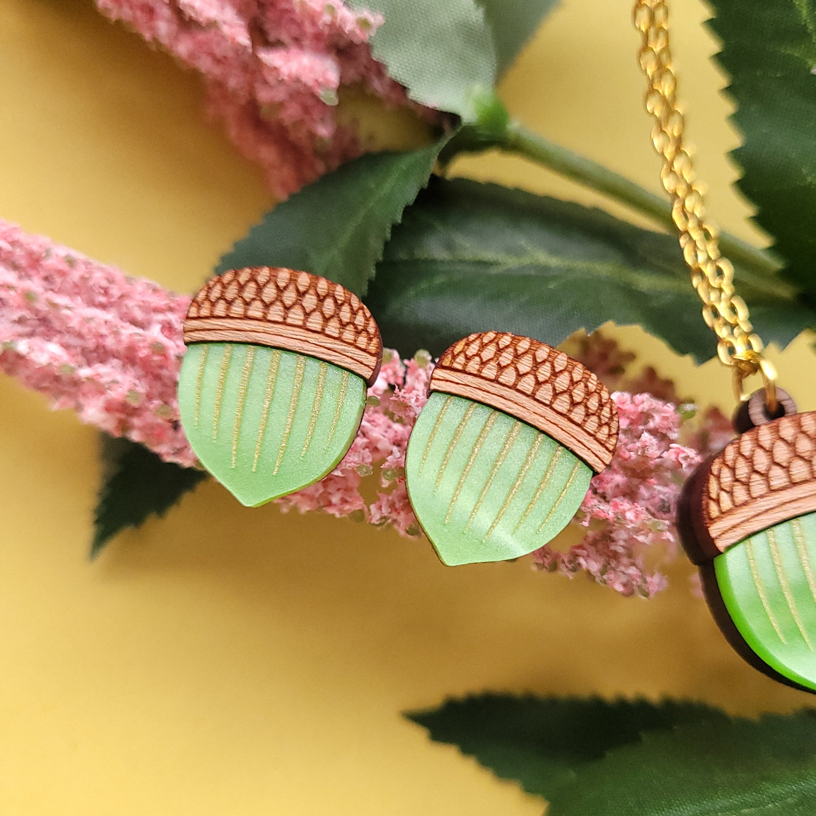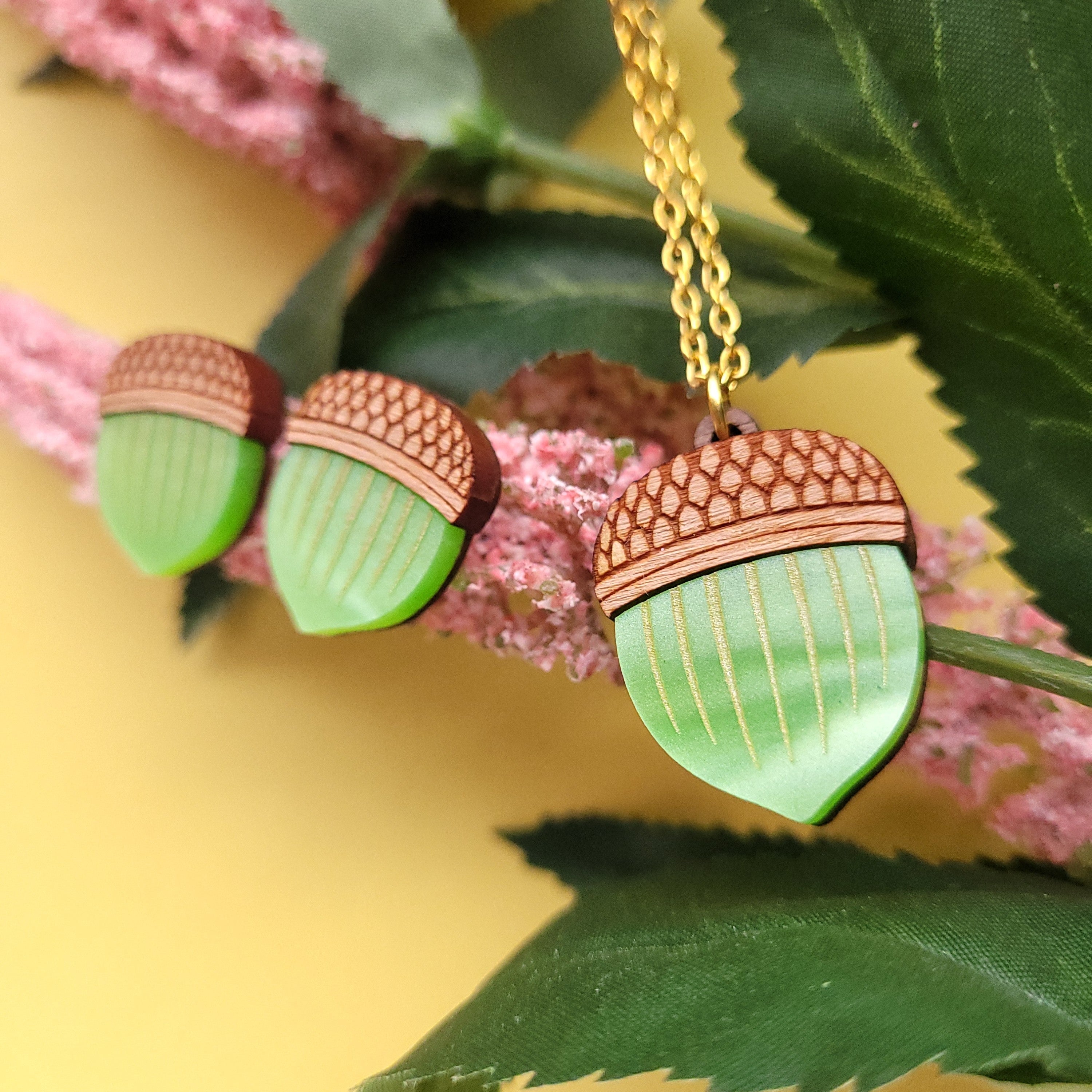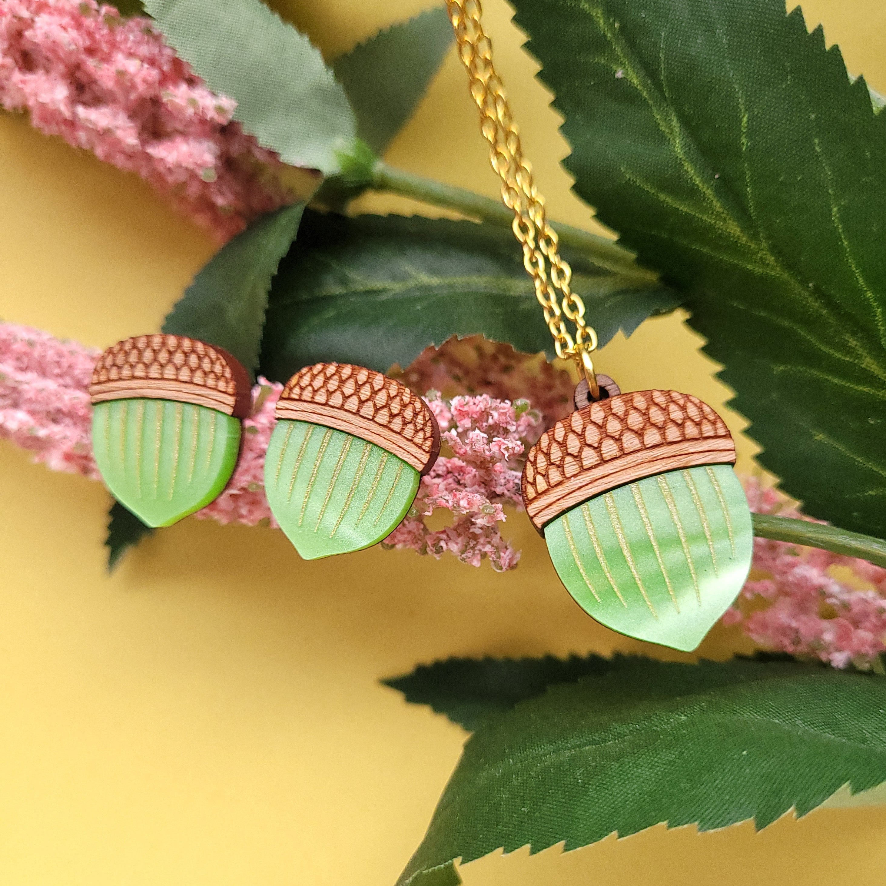 This cute little Acorn Necklace and Earrings features a laser cut acorn made from marbled lime green acrylic and engraved walnut wood. The charm measures 25mm tall and hangs from a plated metal chain, and the earrings measure 19mm tall and have a plated earring post on the back.