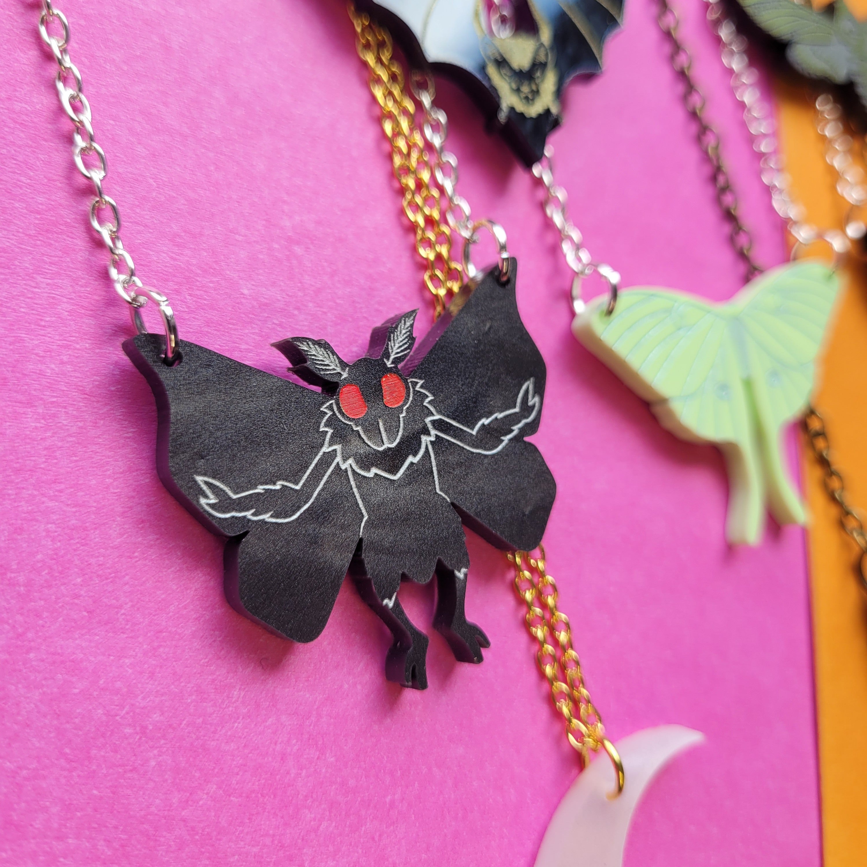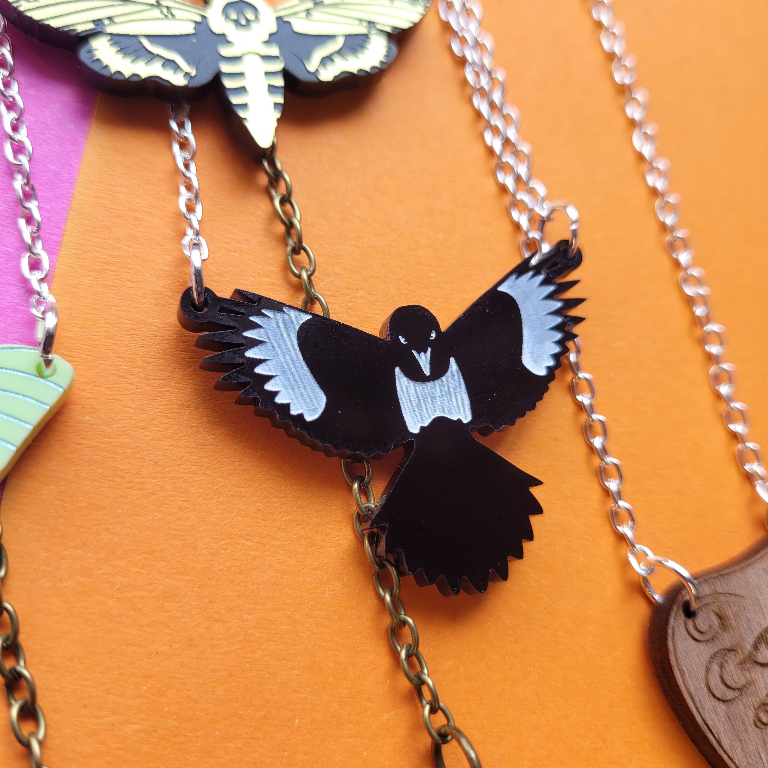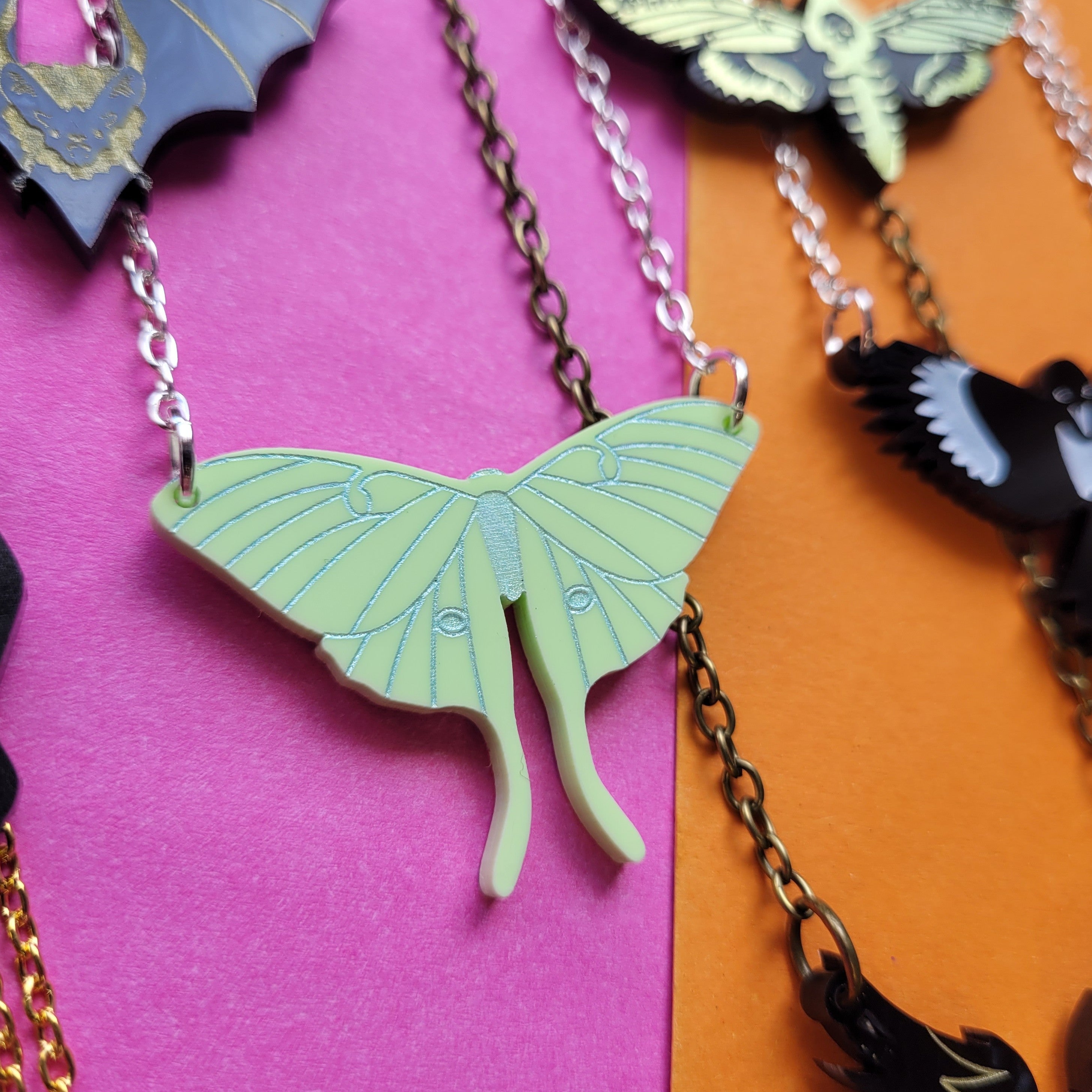 We love a good statement necklace but some days only a dainty charm will do. That's where our smaller Charm Necklaces come in. Grab your favourite motif that's wearable any day of the week, and perfect for anyone looking for something a bit more subtle. There's a crescent moon in white marble, a black marble raven or bat, a mothman with red eyes, a luna moth with metallic accents, a trusty magpie, a planchette made from walnut wood and a gold etched deaths head hawkmoth!