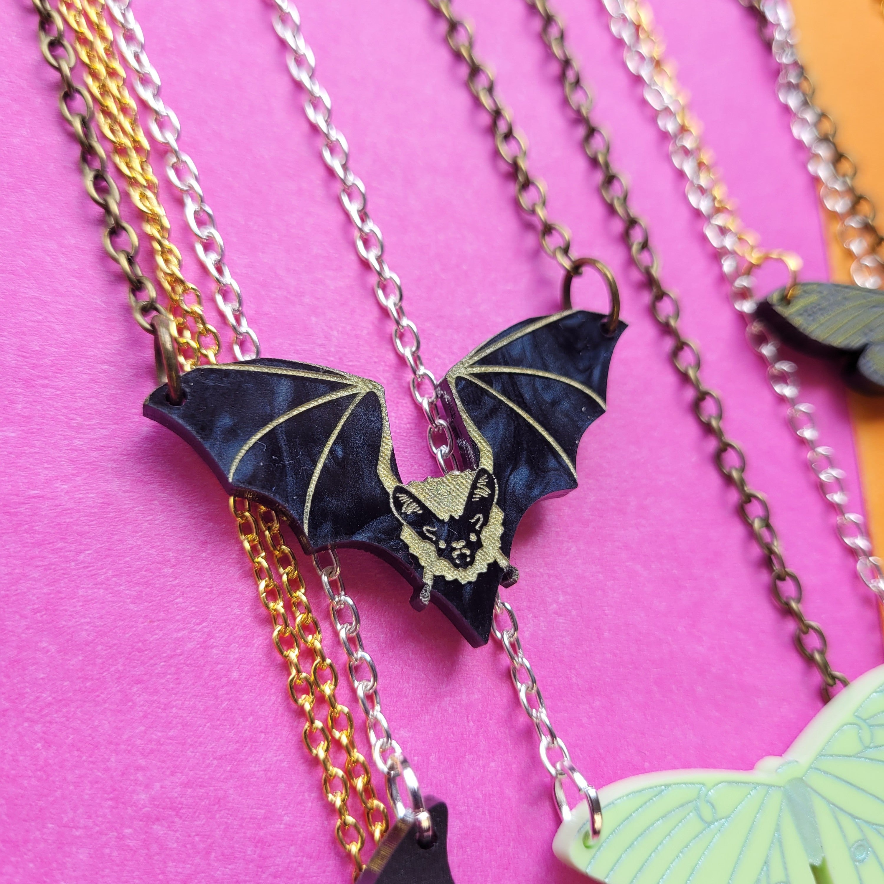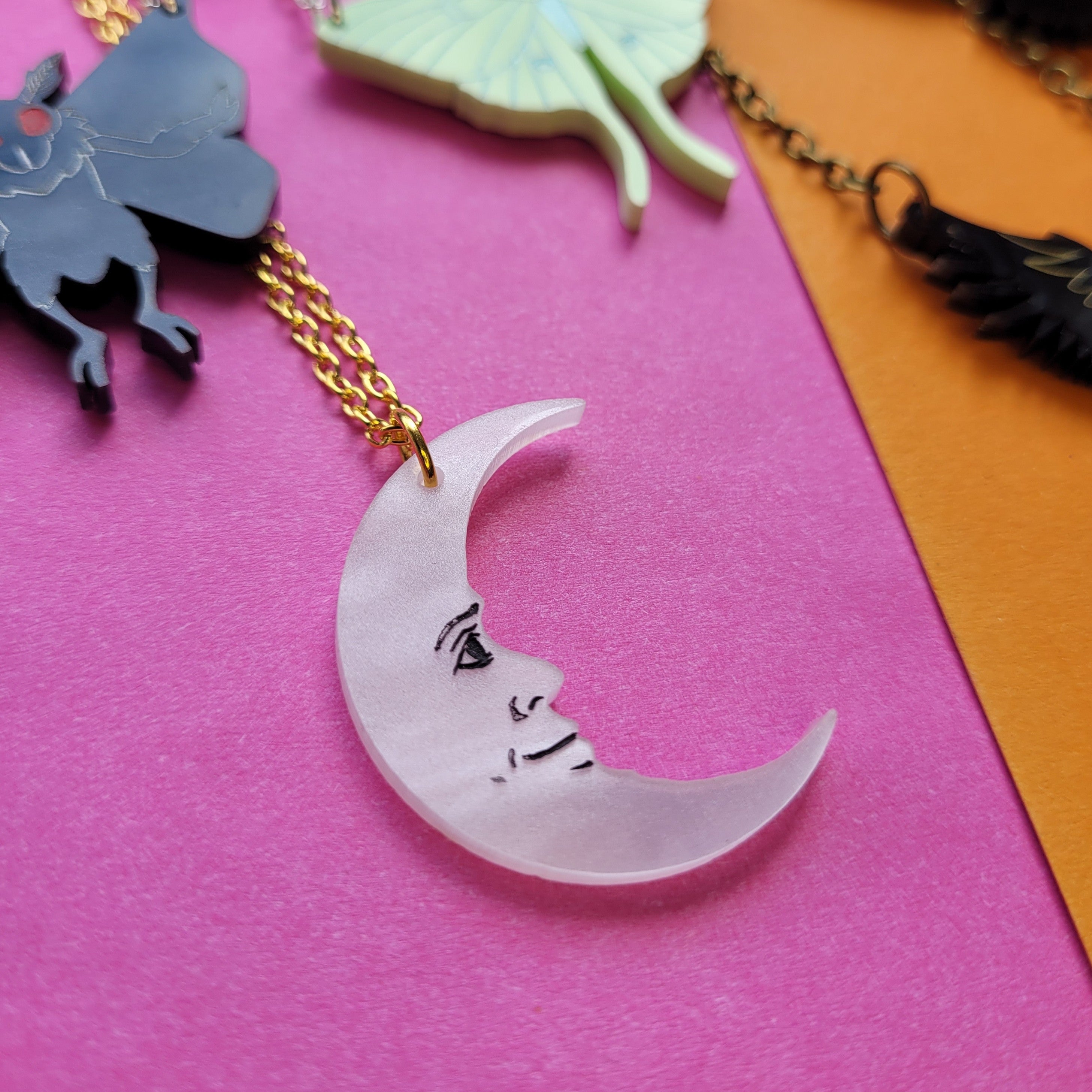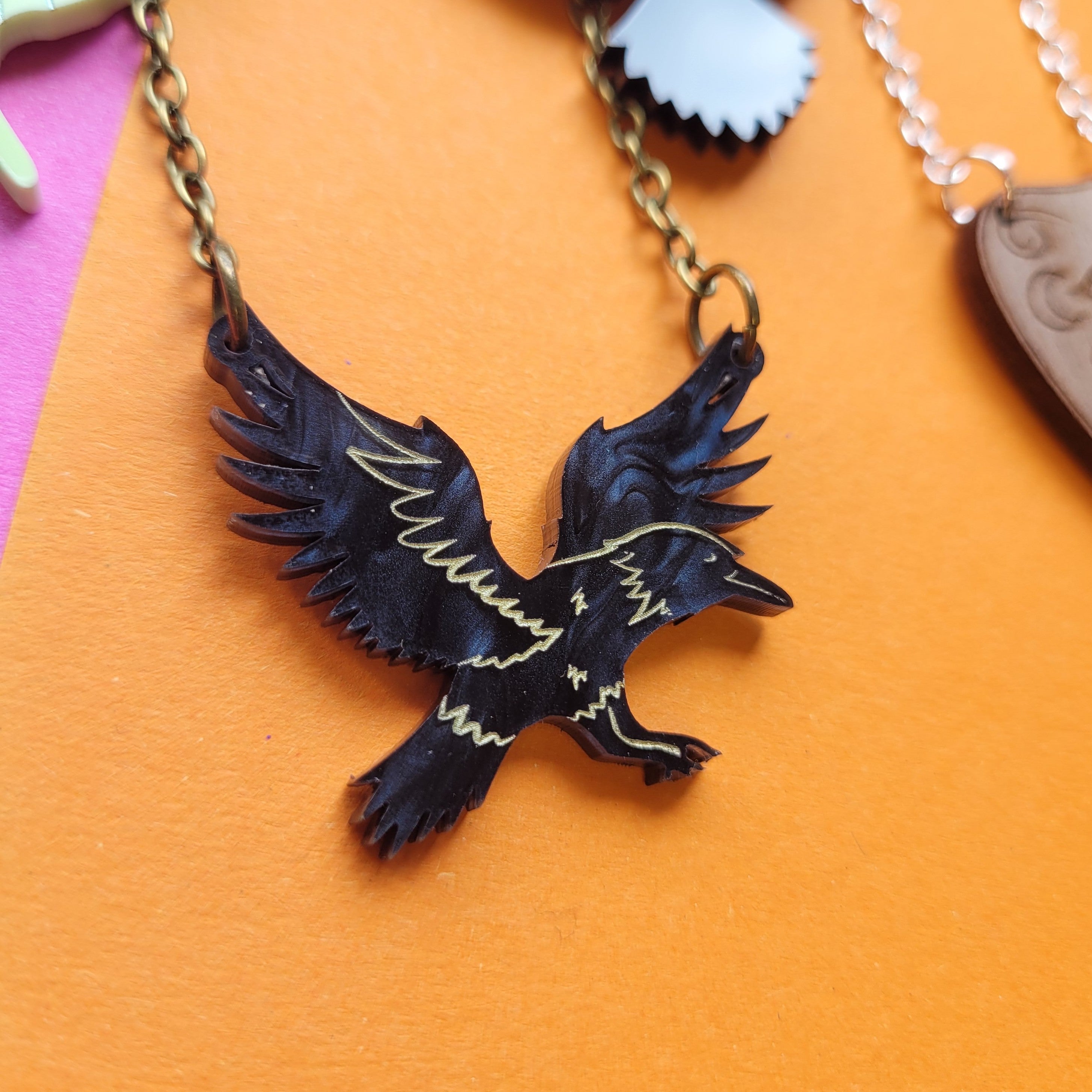 We love a good statement necklace but some days only a dainty charm will do. That's where our smaller Charm Necklaces come in. Grab your favourite motif that's wearable any day of the week, and perfect for anyone looking for something a bit more subtle. There's a crescent moon in white marble, a black marble raven or bat, a mothman with red eyes, a luna moth with metallic accents, a trusty magpie, a planchette made from walnut wood and a gold etched deaths head hawkmoth!