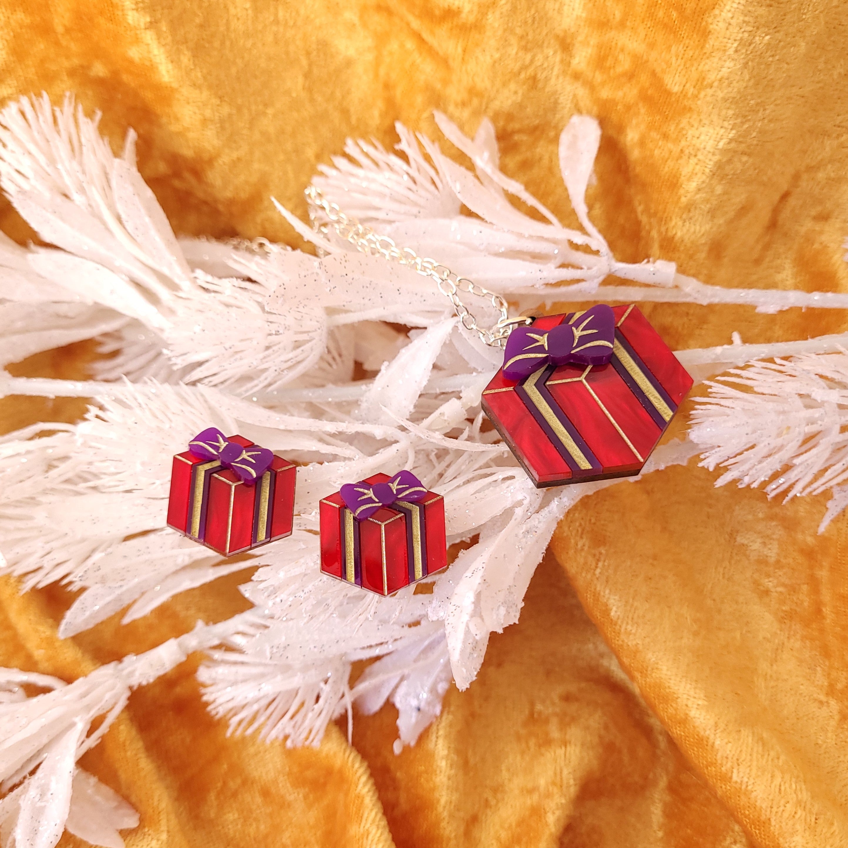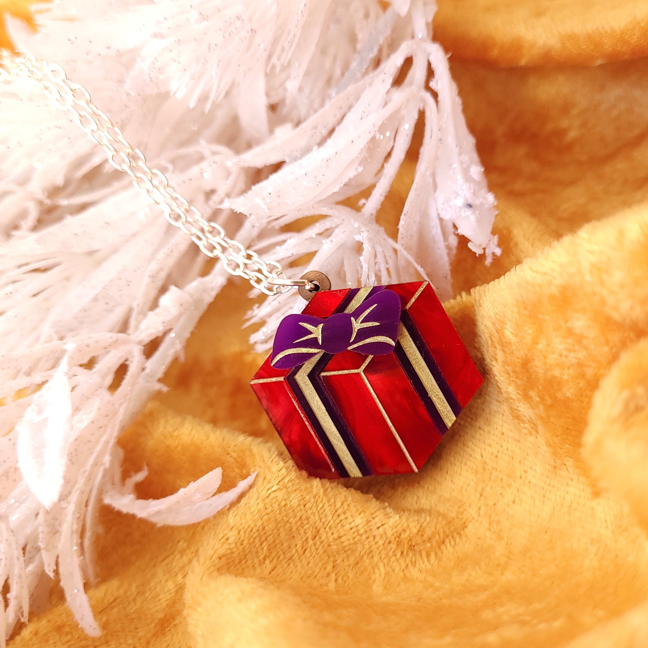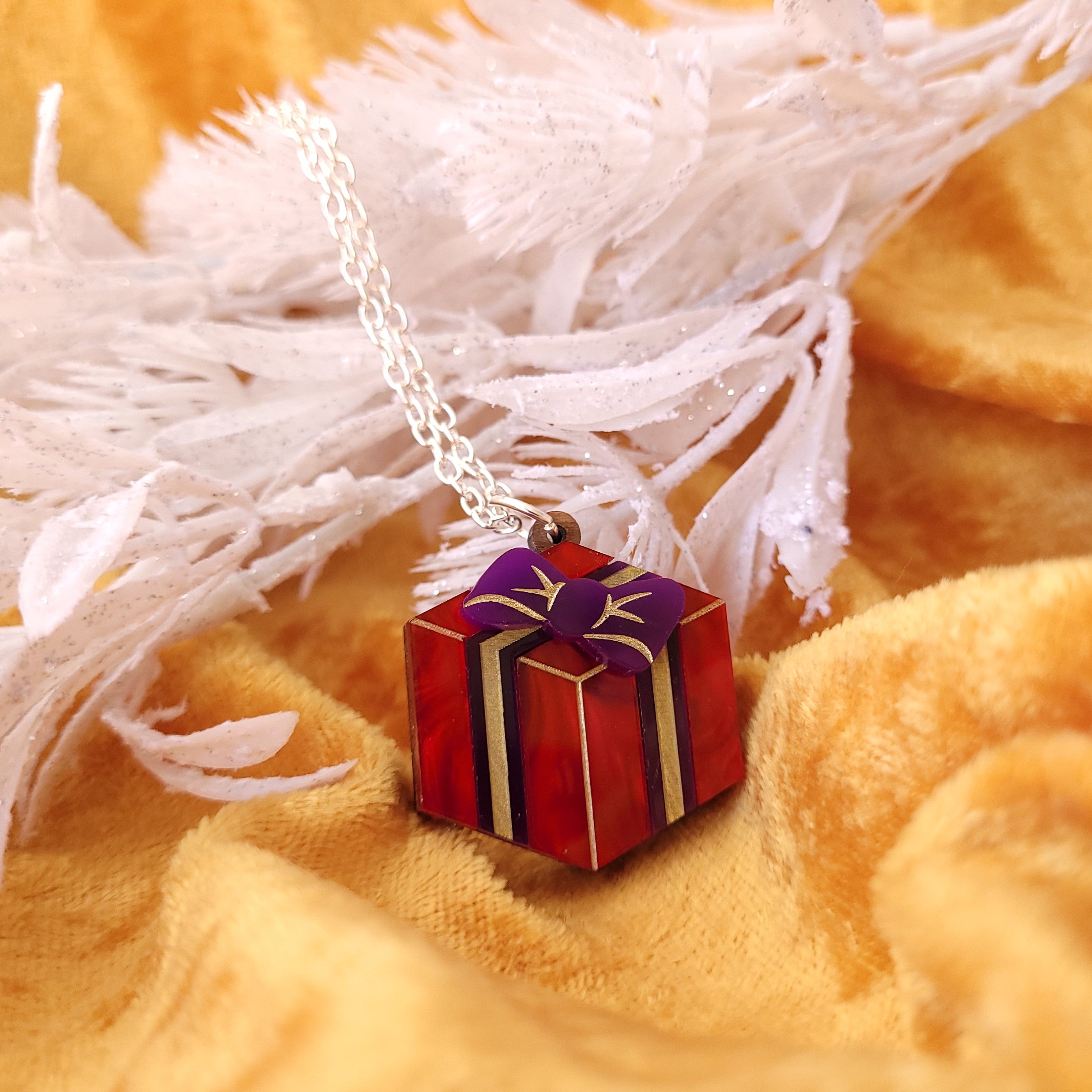 Our little Christmas Present necklace is laser cut acrylic from premium red marble and purple opaque acrylic, with a sustainable walnut wood backing. It measures approximately 34mm tall and hangs from a plated alloy metal chain.