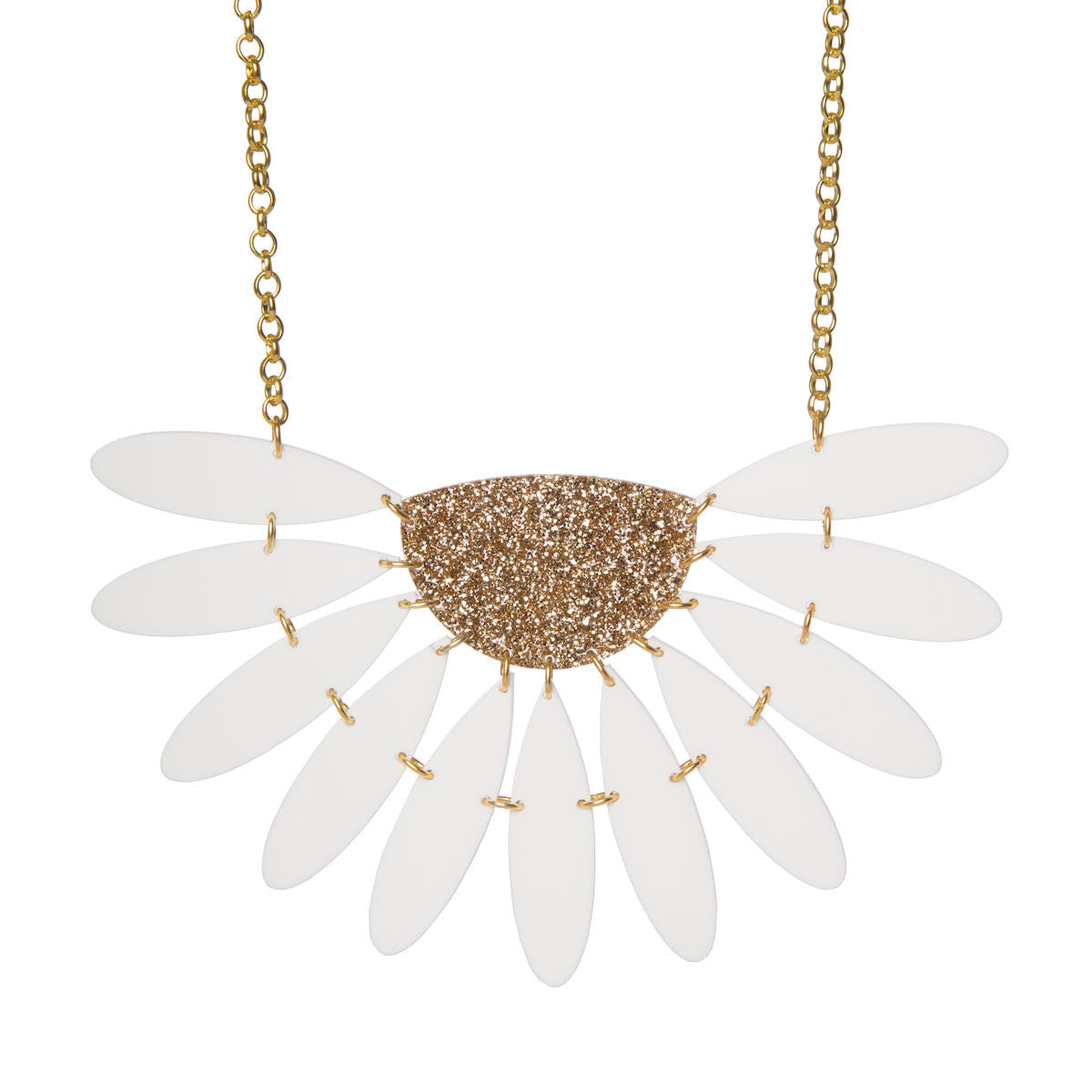 No need to lose a single petal with our oversize Daisy Necklace, consisting of matte white laser cut acrylic petals and a gold glittery centre. It measures approximately 120mm wide and hangs from a chunky plated chain.