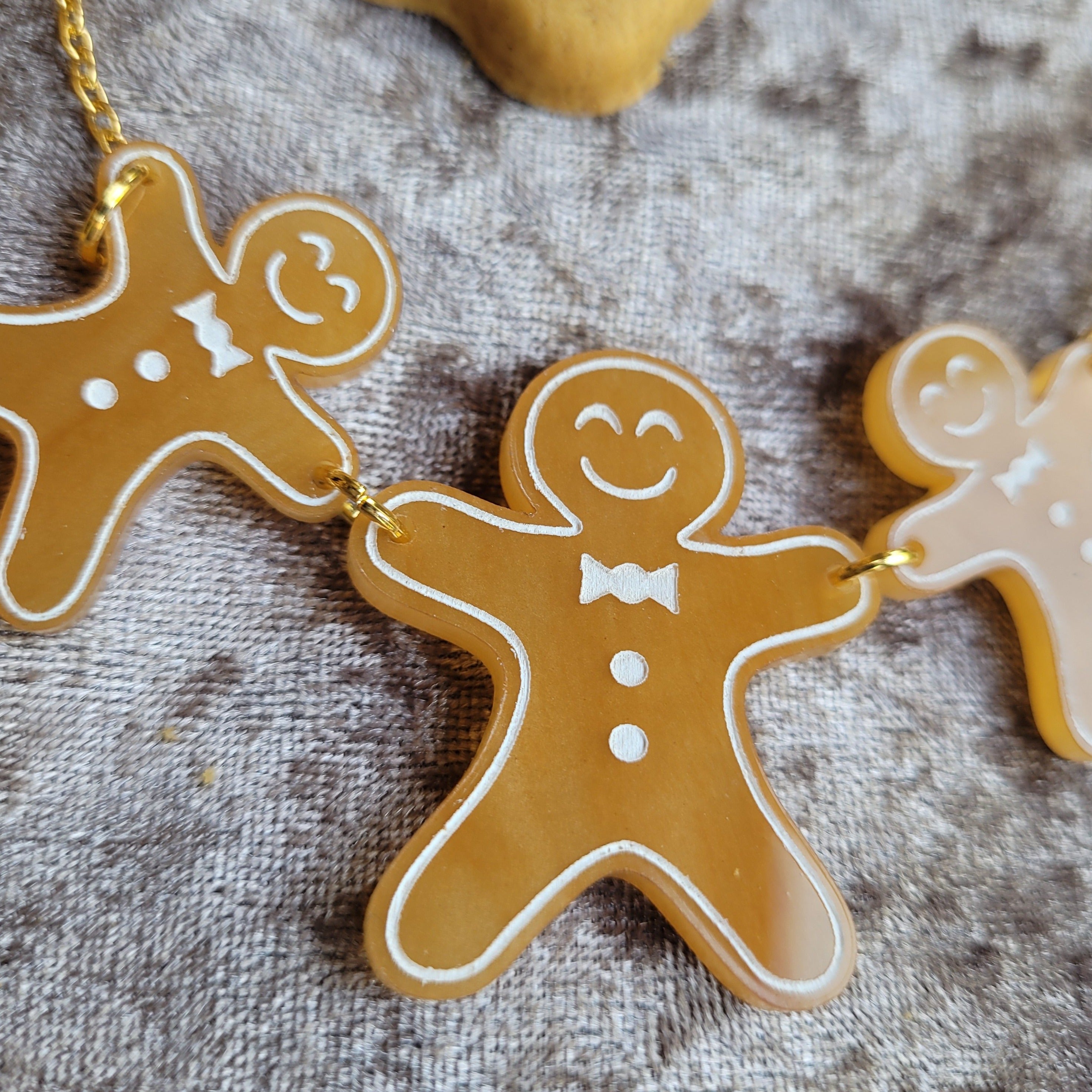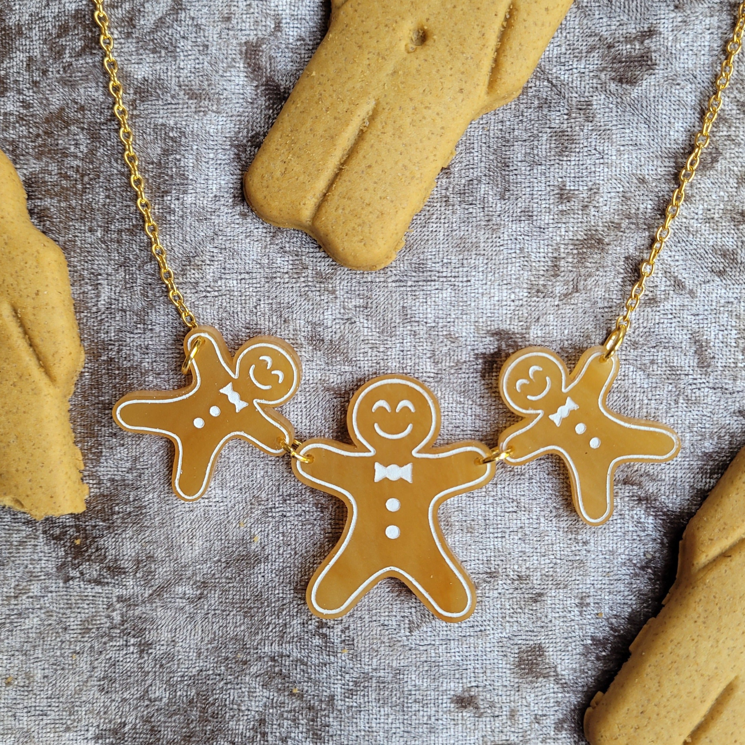 Three adorable Gingerbread Men comprise this festive necklace. The charms measure approximately 35-45mm, are laser cut from pale brown marbled acrylic, engraved and hand-inked and strung between a plated chain.