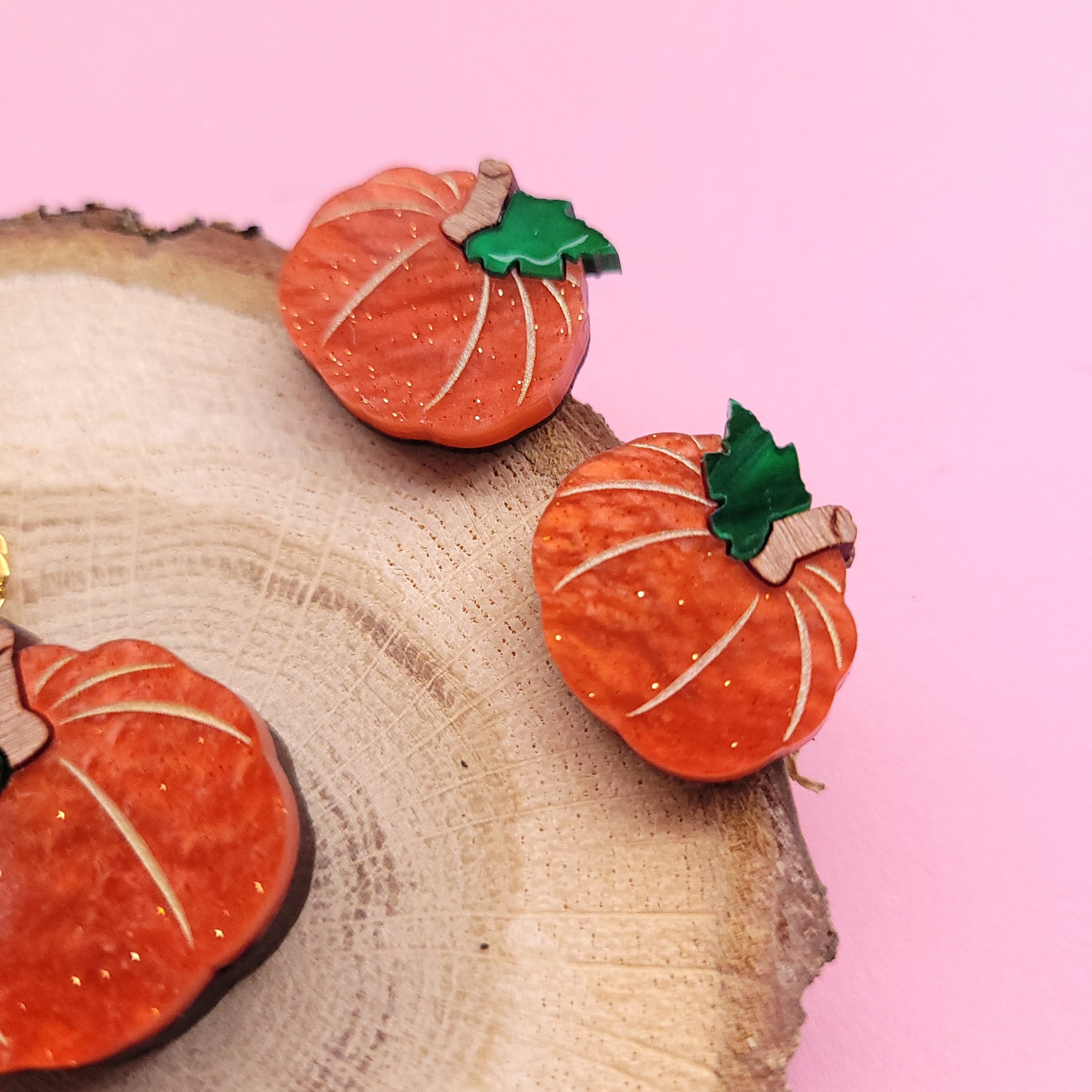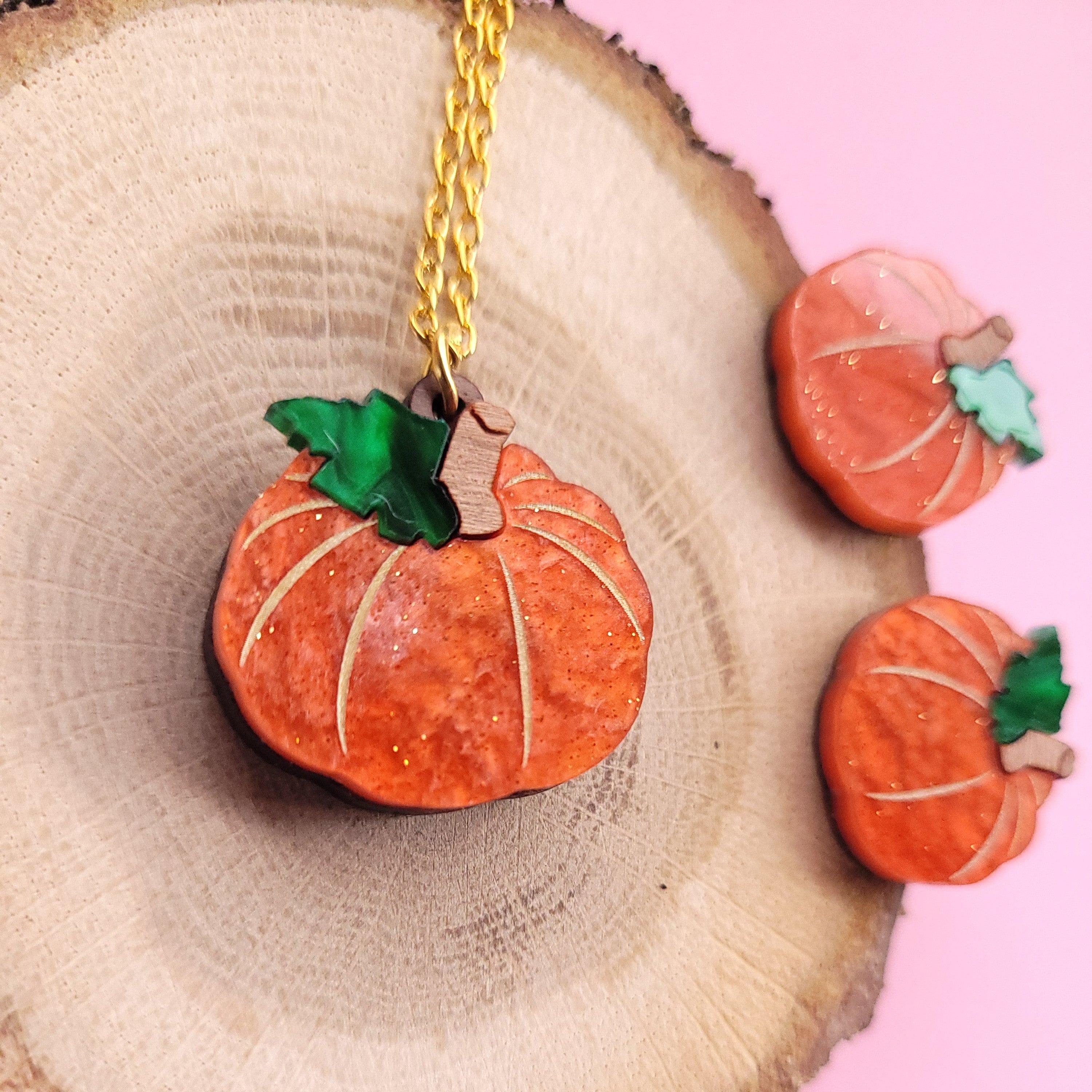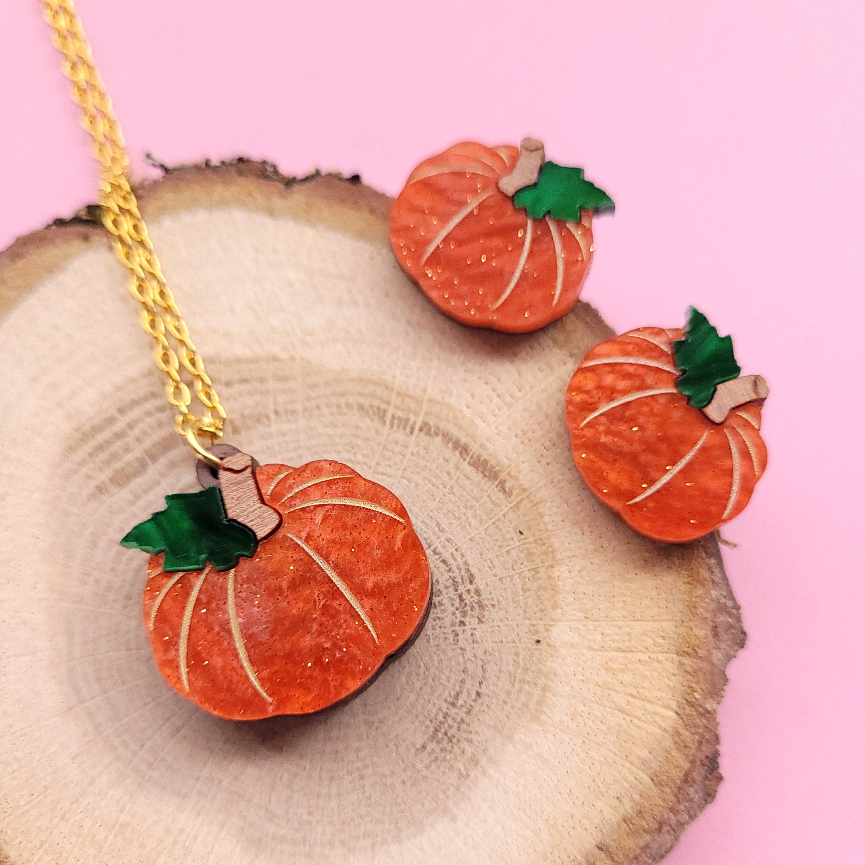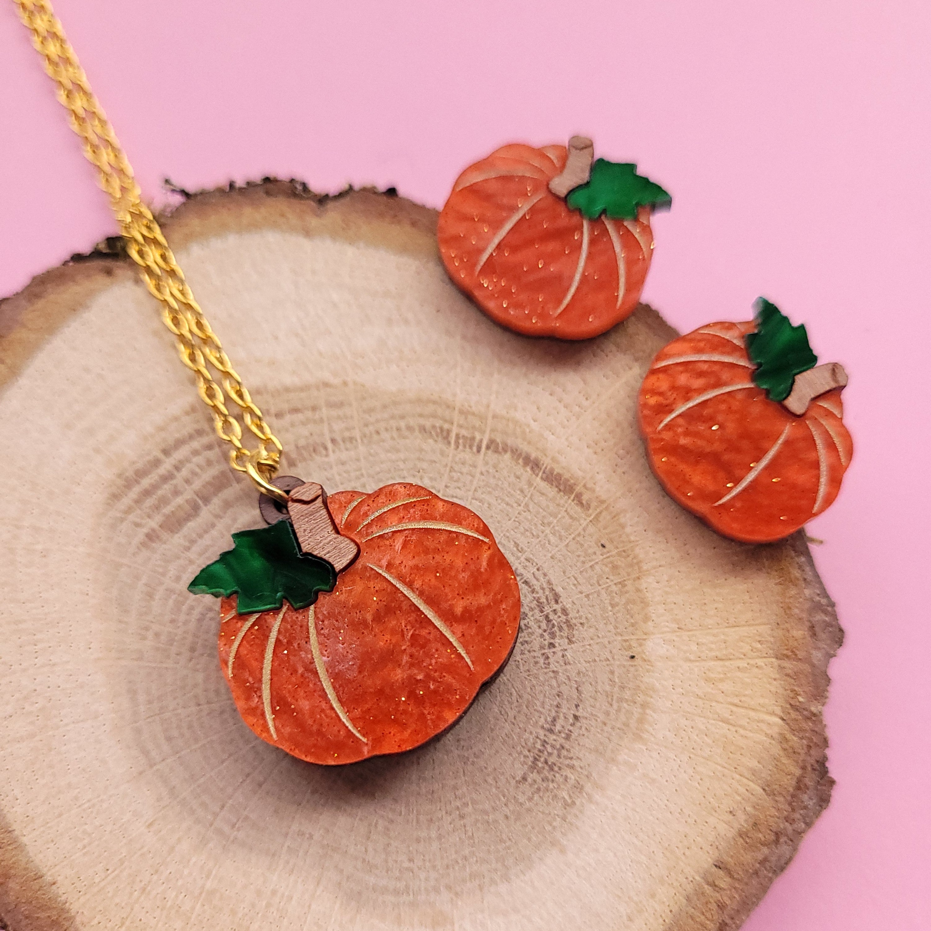 This bright Pumpkin Necklace and Earrings feature a laser cut charm made from sparkly marbled orange and green acrylic and engraved walnut wood. The charm measures 25mm wide and hangs from a plated metal chain, and the earrings measure 19mm wide and have a plated earring post on the back.