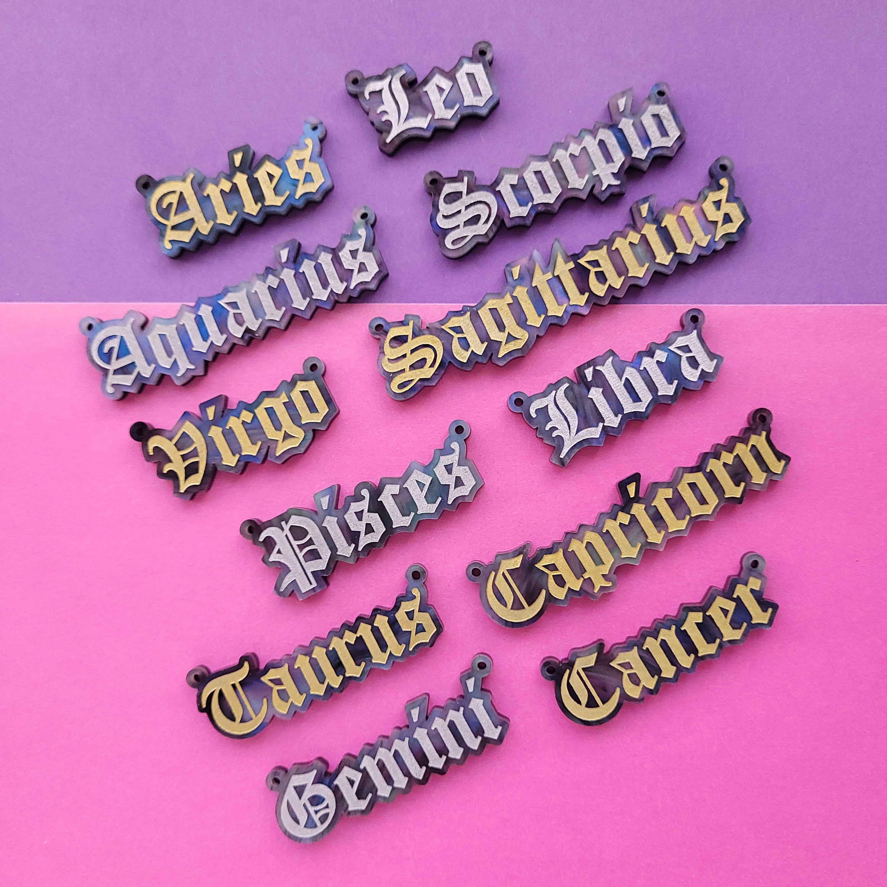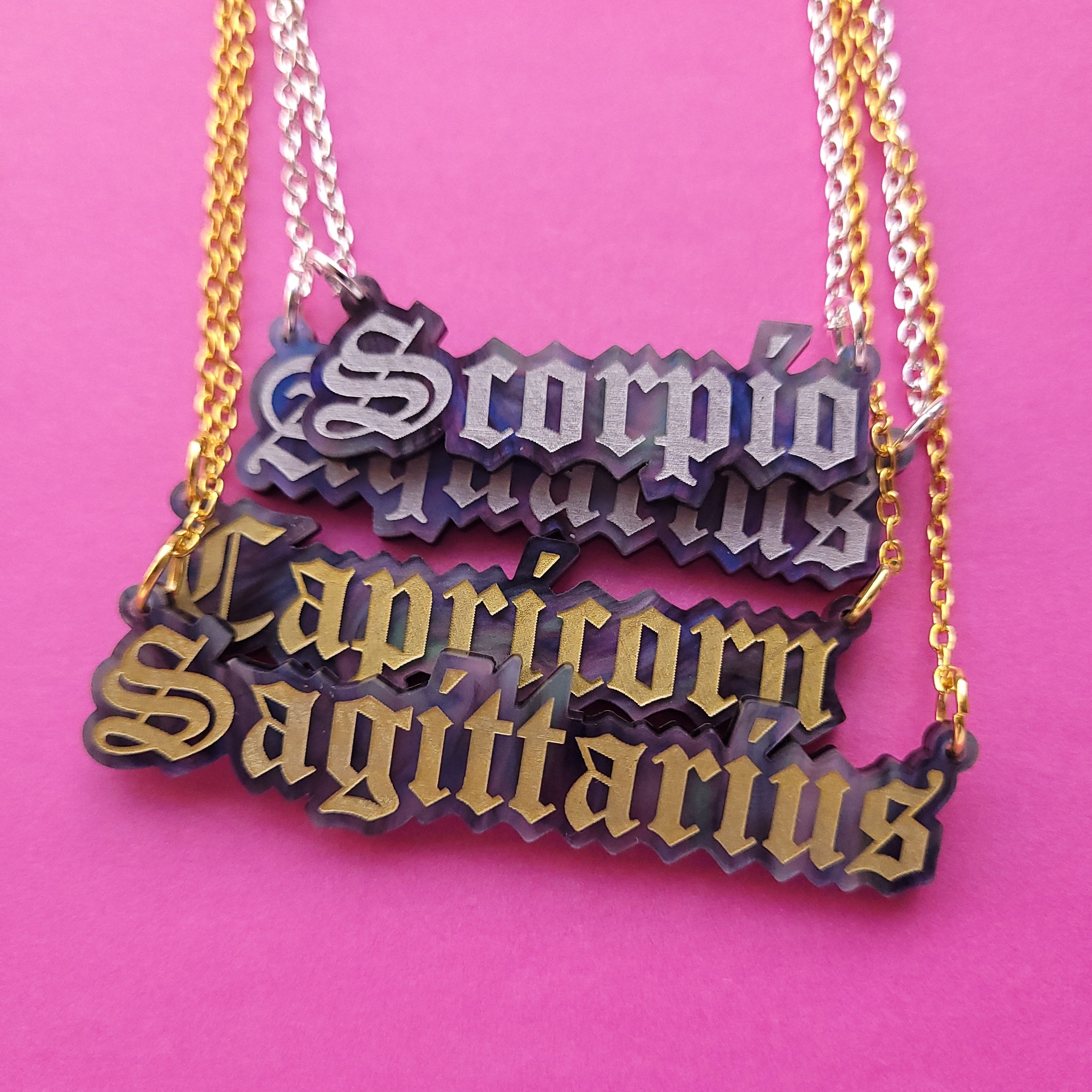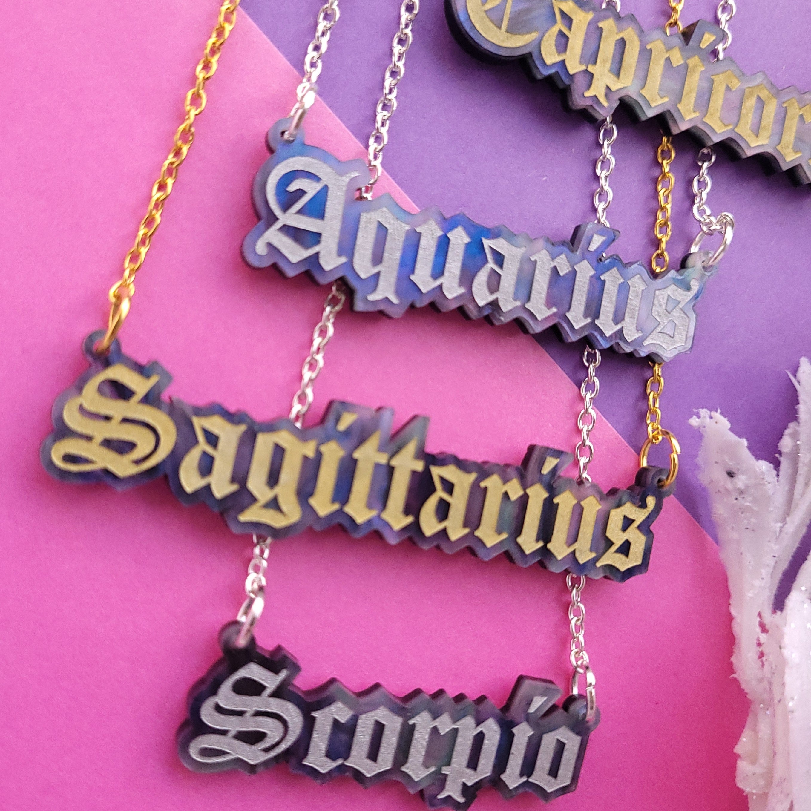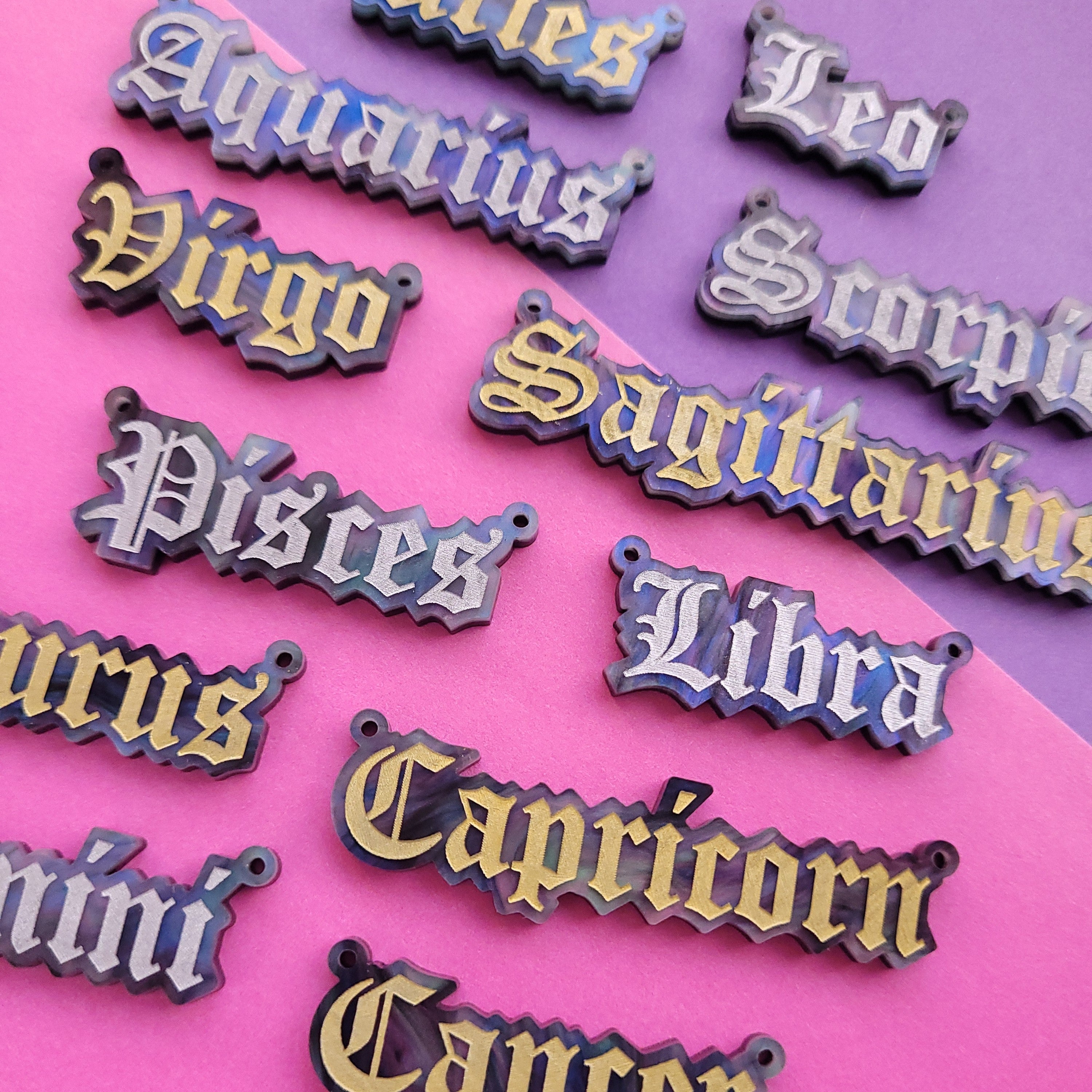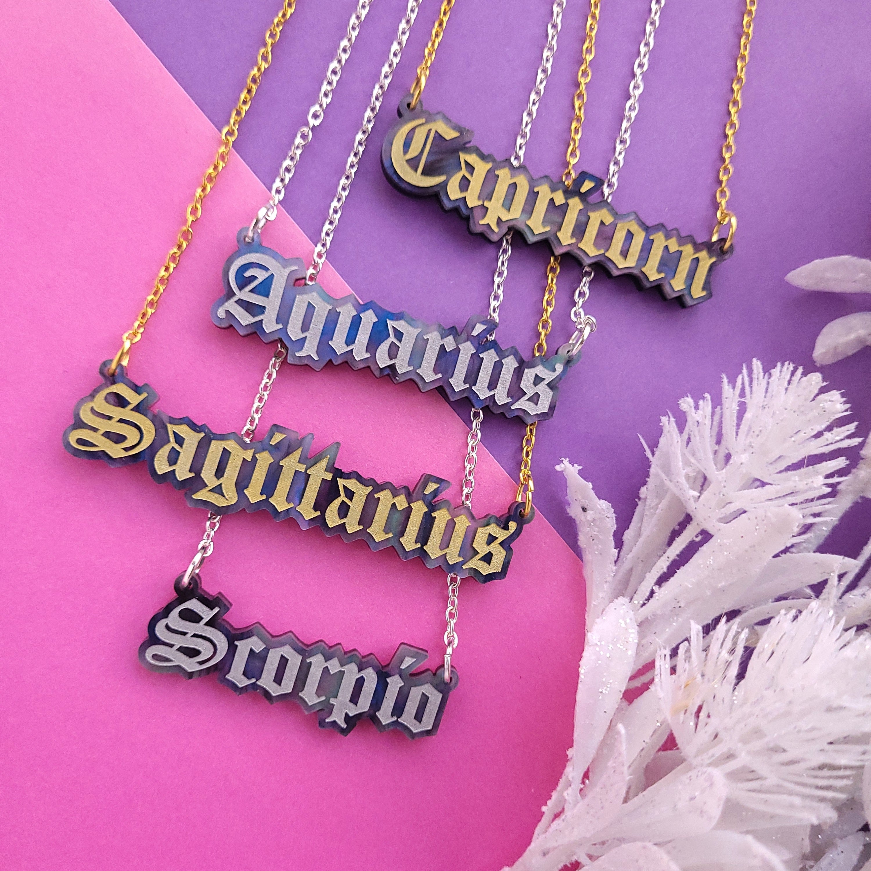 Our Star Sign necklaces are laser cut from premium marbled galaxy acrylic, with an engraved and hand-inked astrological sign. They measure between 26mm (Leo) and 71mm (Sagittarius) wide, and hang between a plated alloy metal chain.