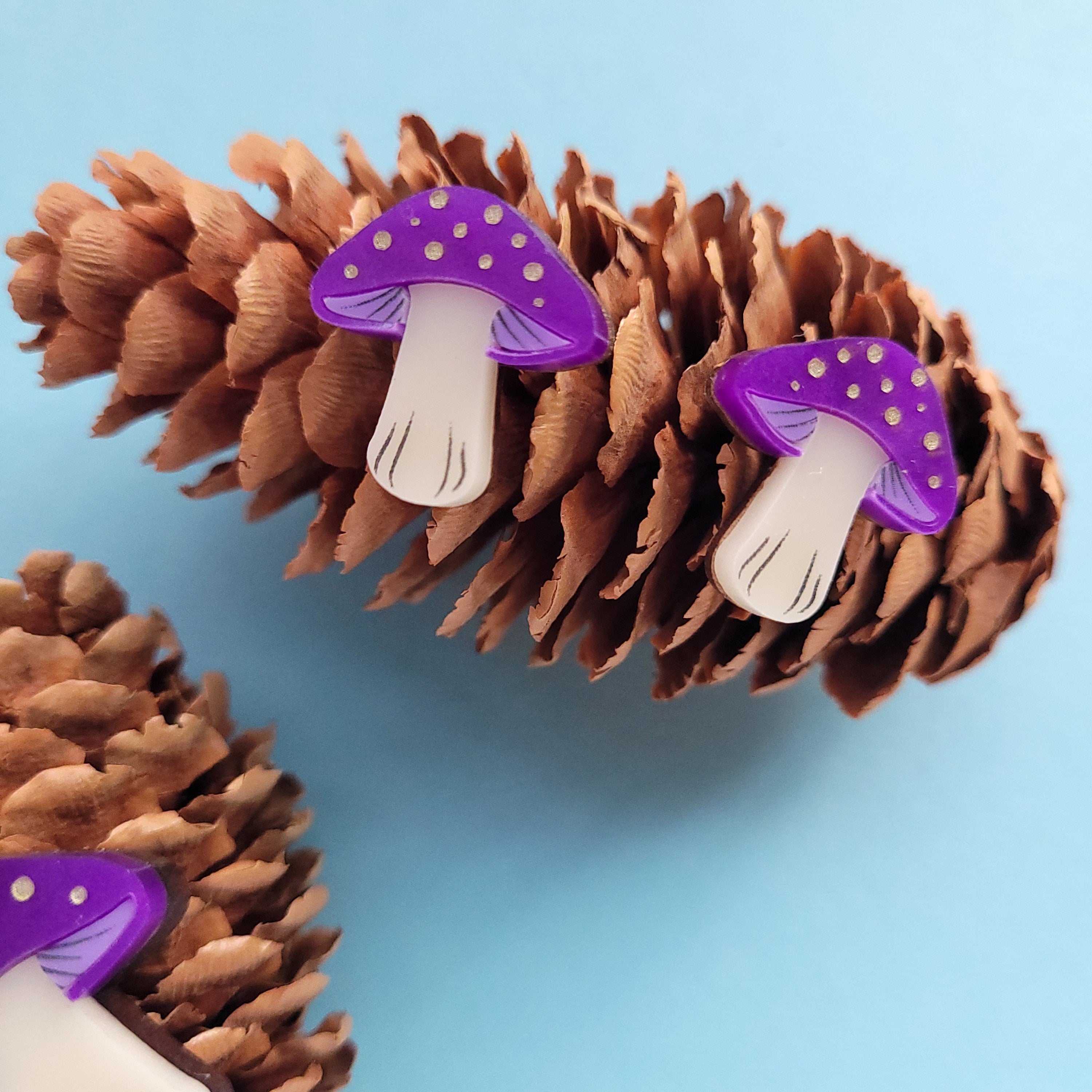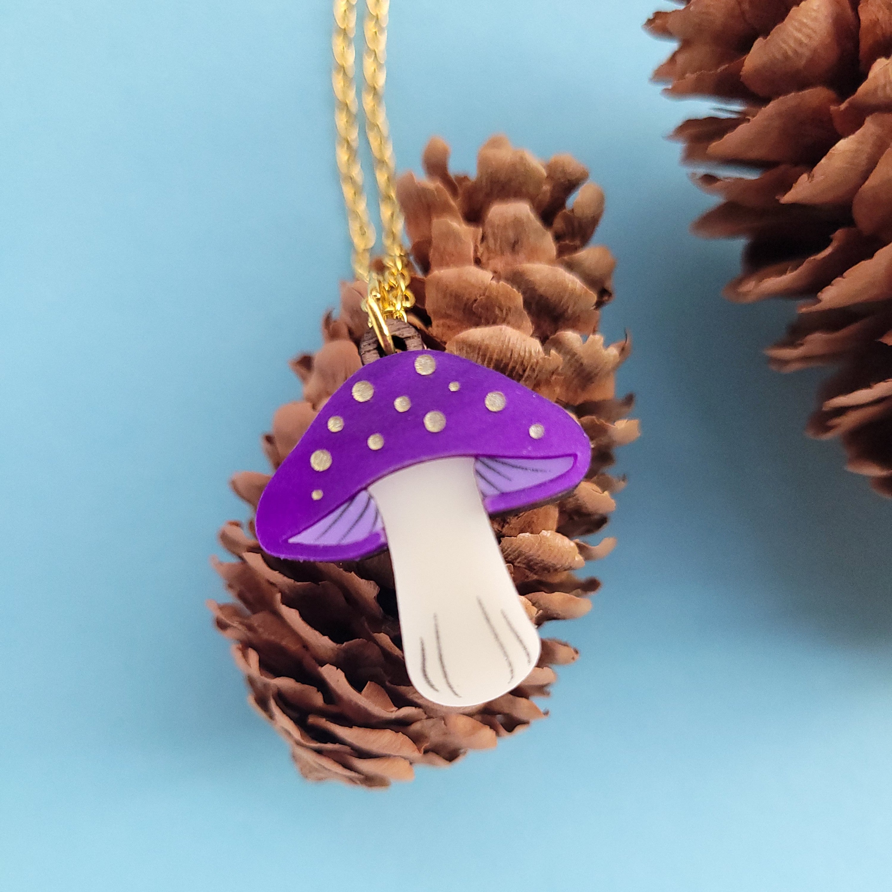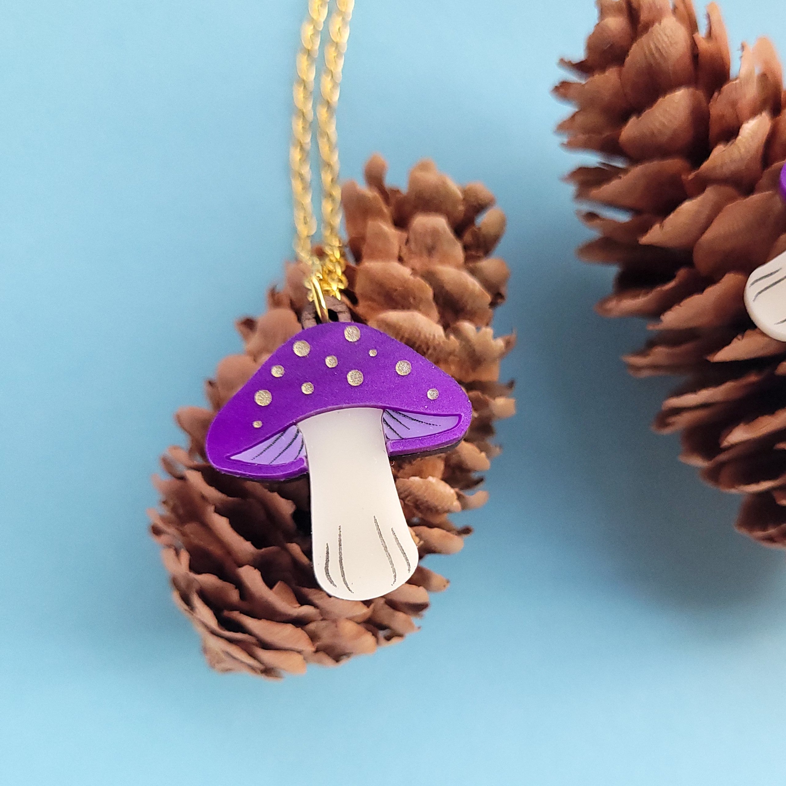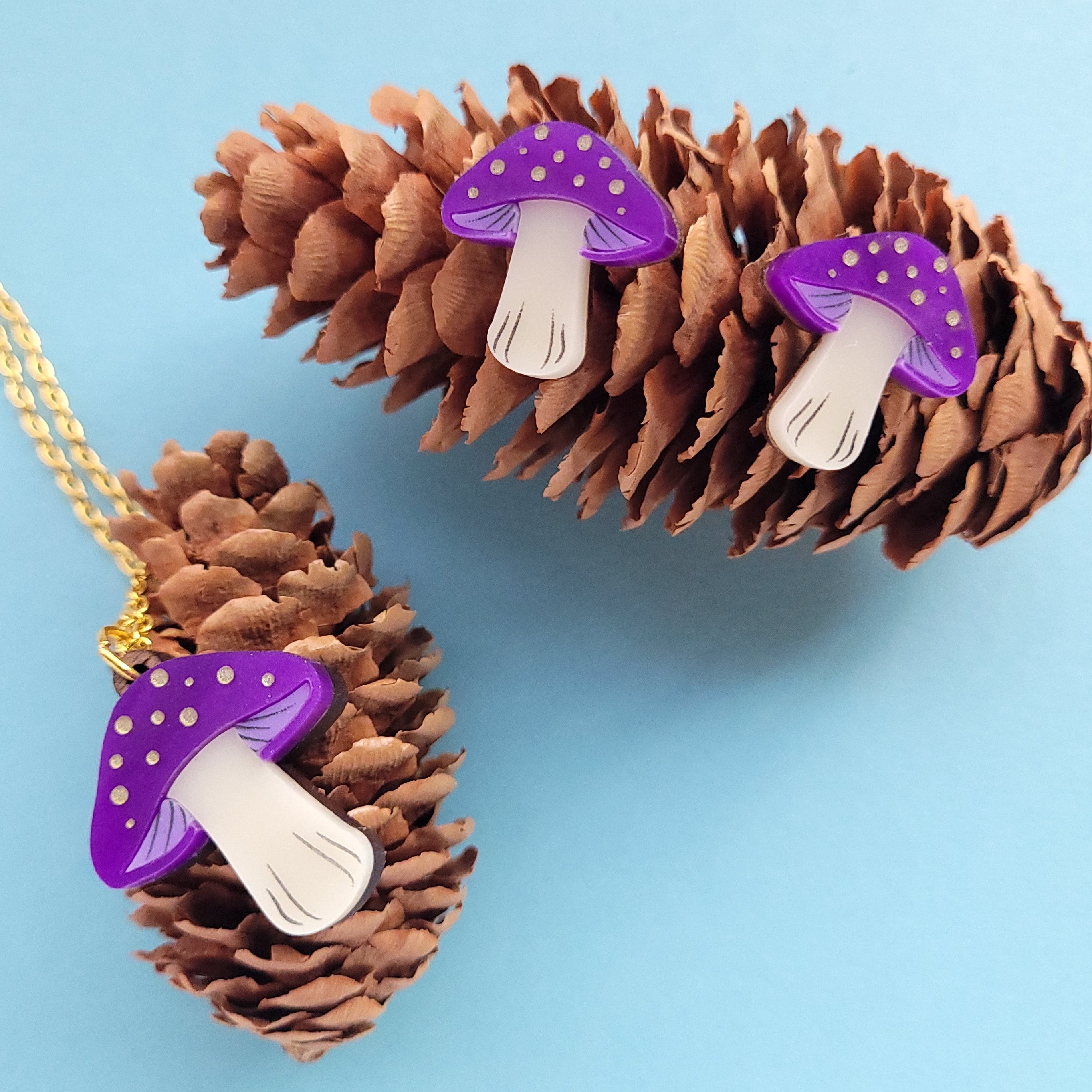 This cute little purple Mushroom Necklace and Earrings features a laser cut charm made from marbled purple, ivory and lilac acrylic. The charm measures 26mm tall and hangs from a plated metal chain, and the earrings measure 20mm tall and have a plated earring post on the back.