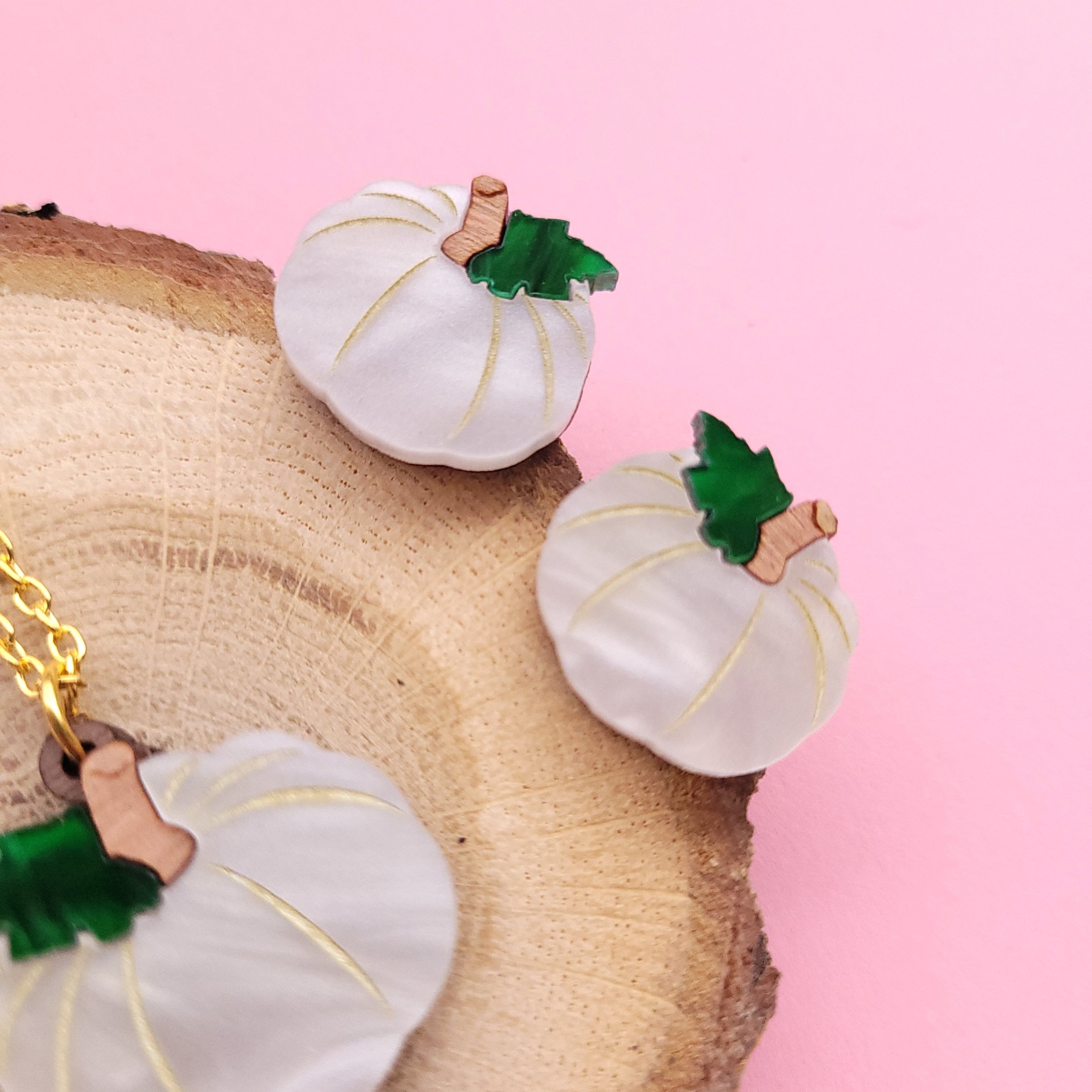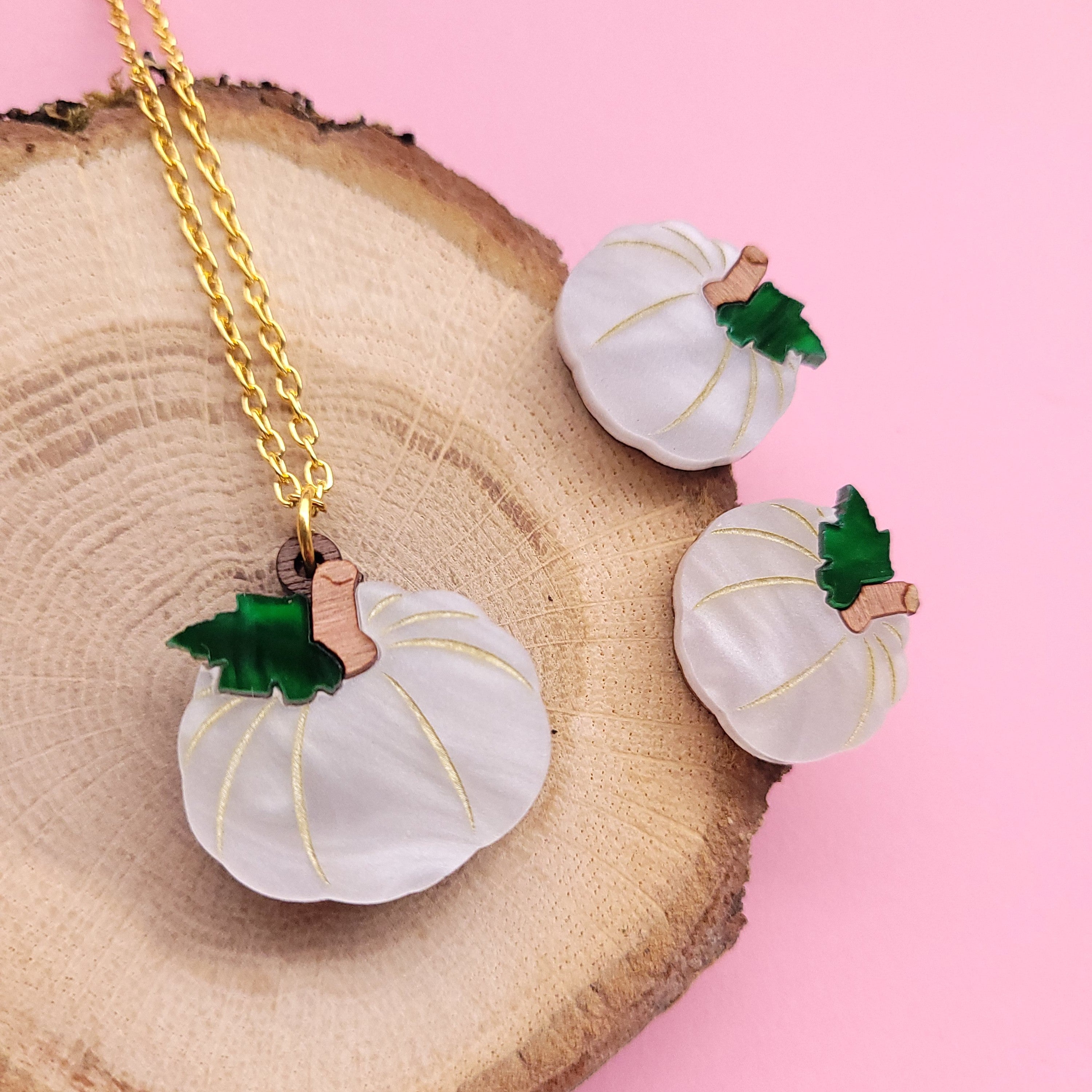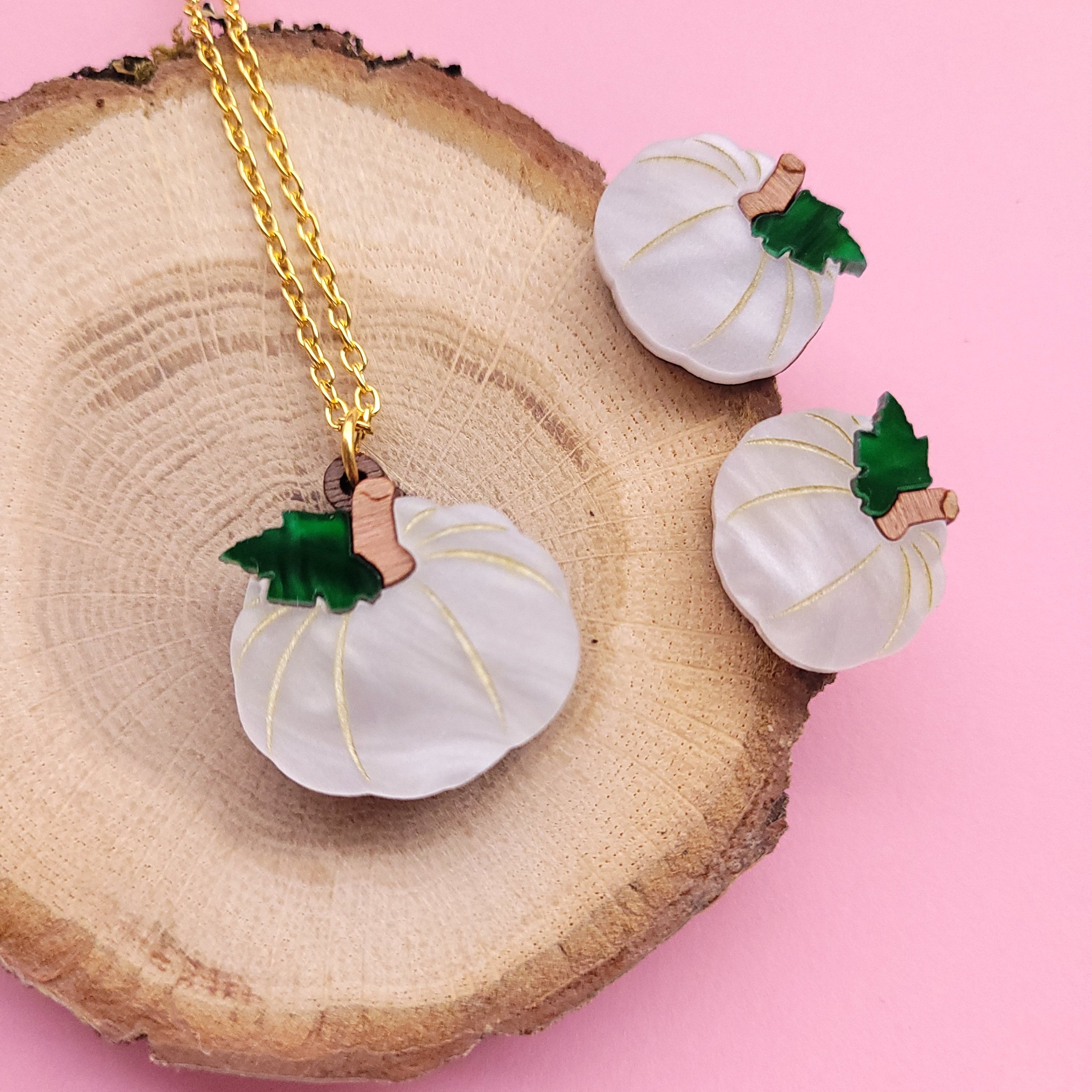 This cute Pumpkin Necklace and Earrings features a laser cut charm made from marbled white and green acrylic and engraved walnut wood. The charm measures 25mm wide and hangs from a plated metal chain, and the earrings measure 19mm wide and have a plated earring post on the back.