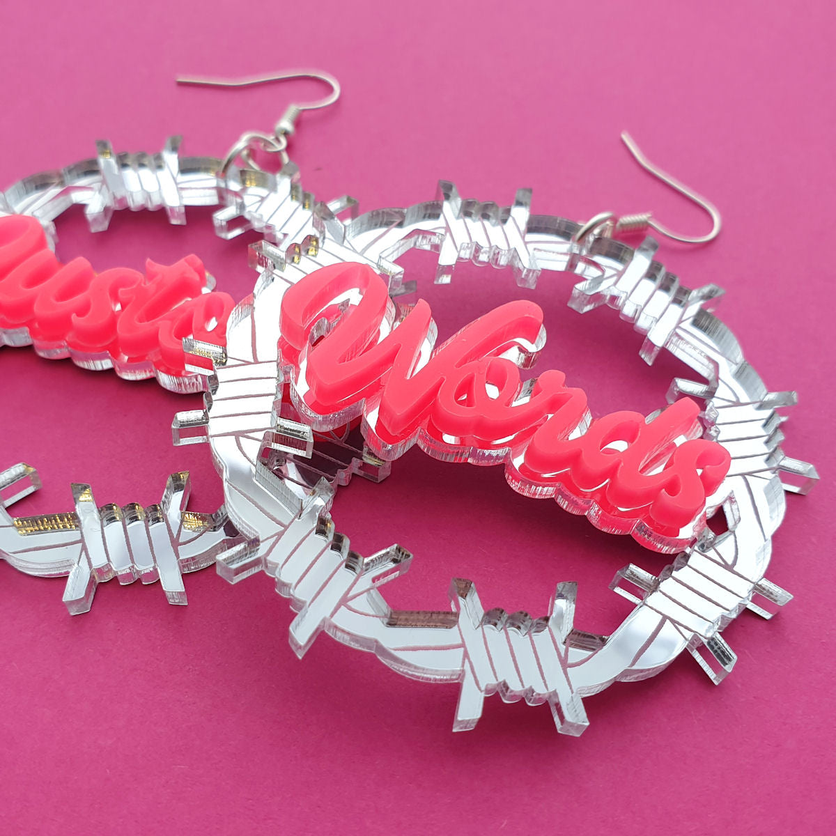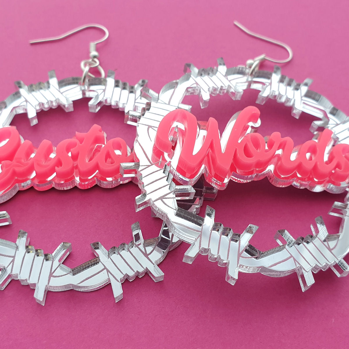 Our Barbed Wire Earrings are laser cut and etched with detail in silver mirror acrylic with an opaque lettering foreground, and measure approximately 60mm round. They each have a silver plated earring wire attached. Choose which names/words you'd likeᅠthem personalised with in the boxes below!