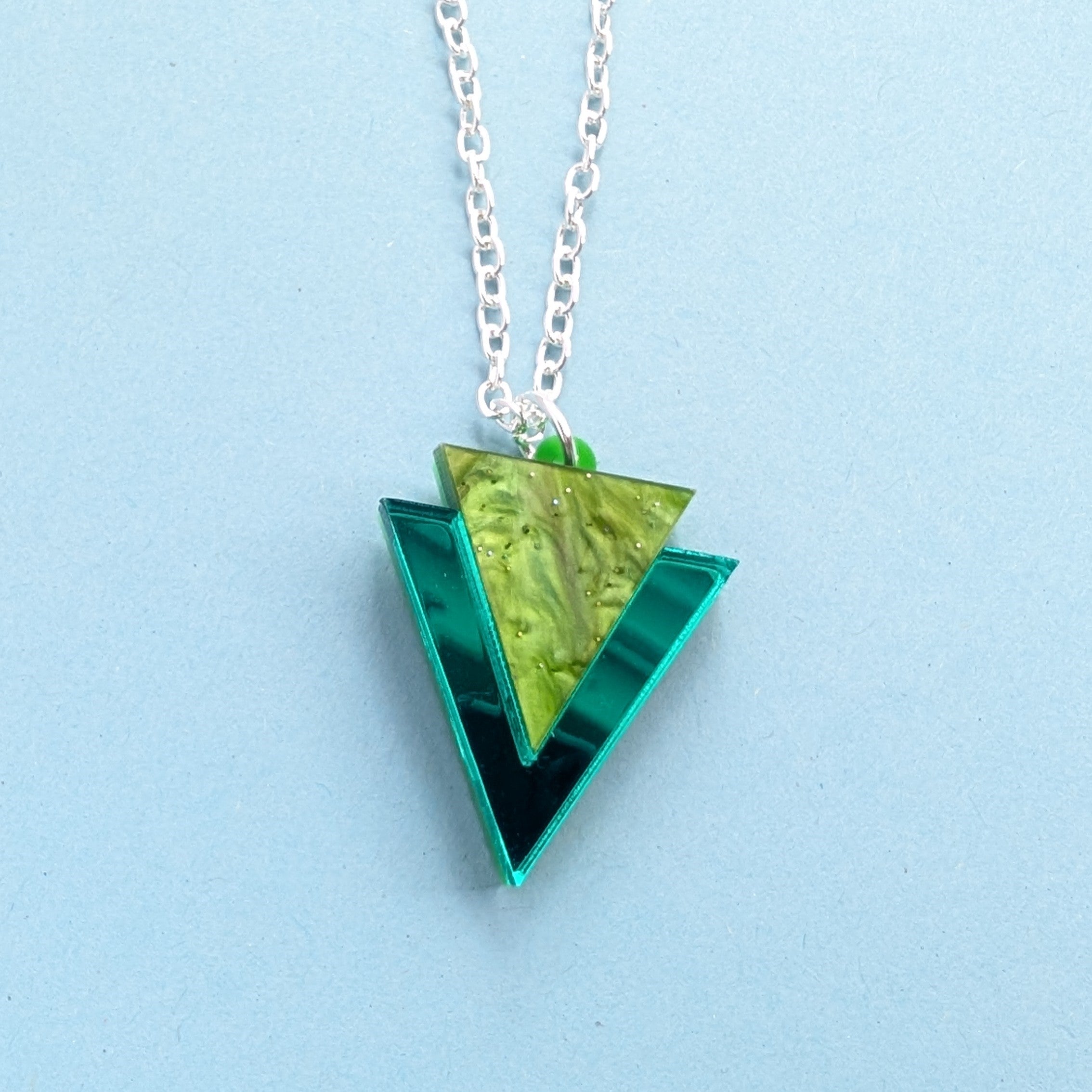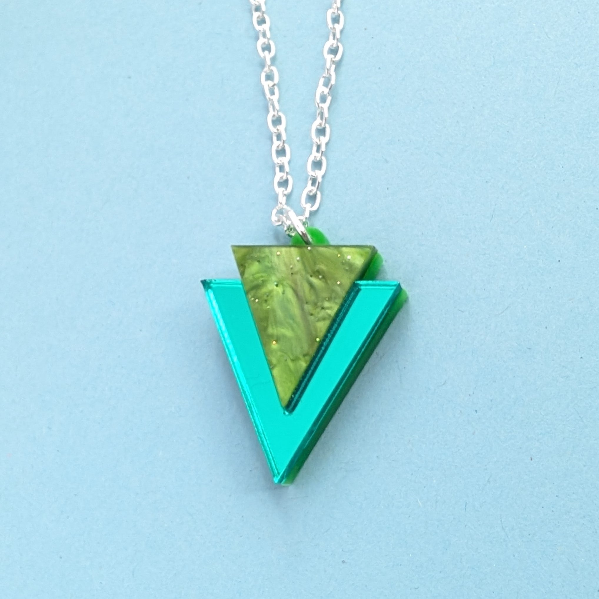 A laser cut acrylic pendant, measuring 30mm tall and hanging from an 18" silver plated chain.