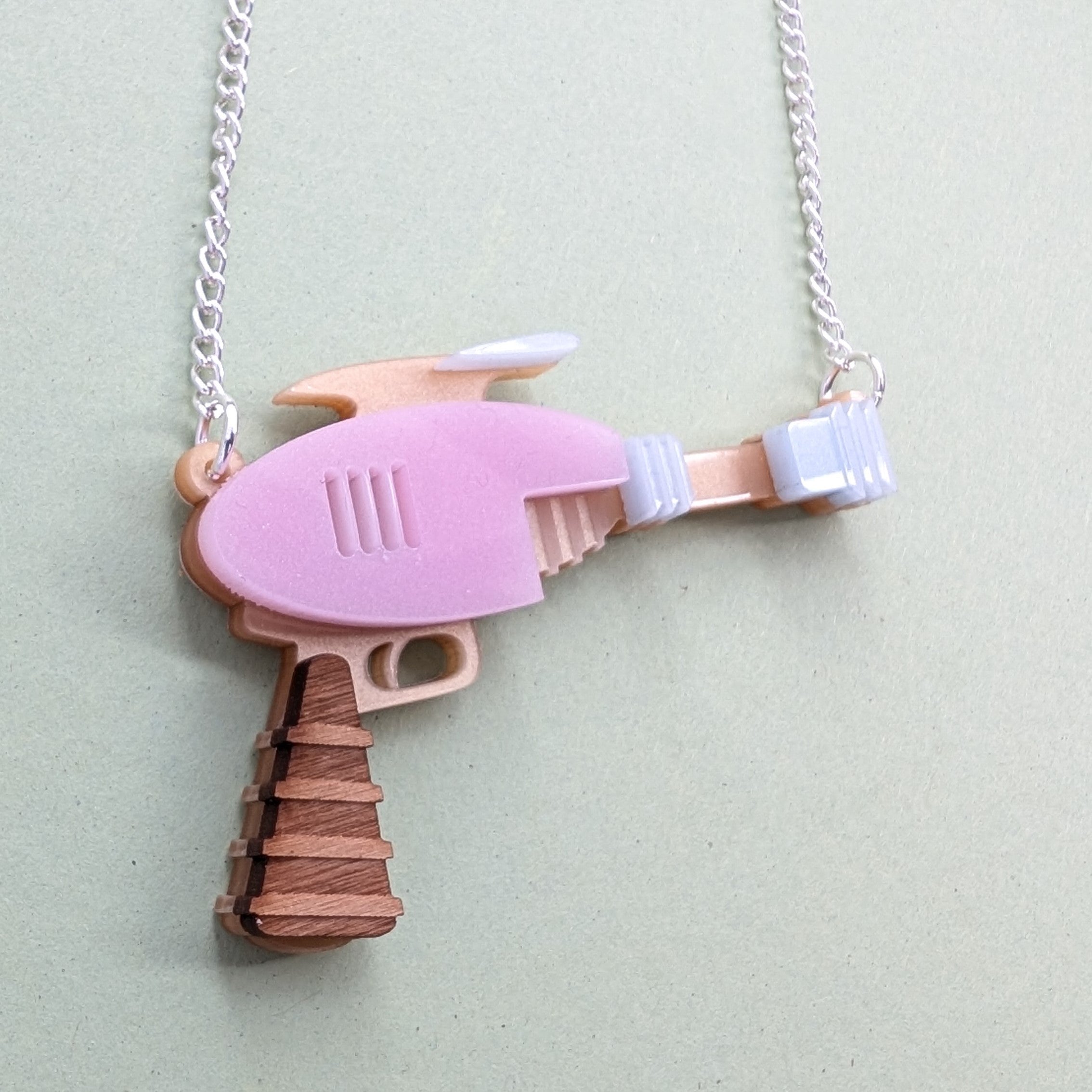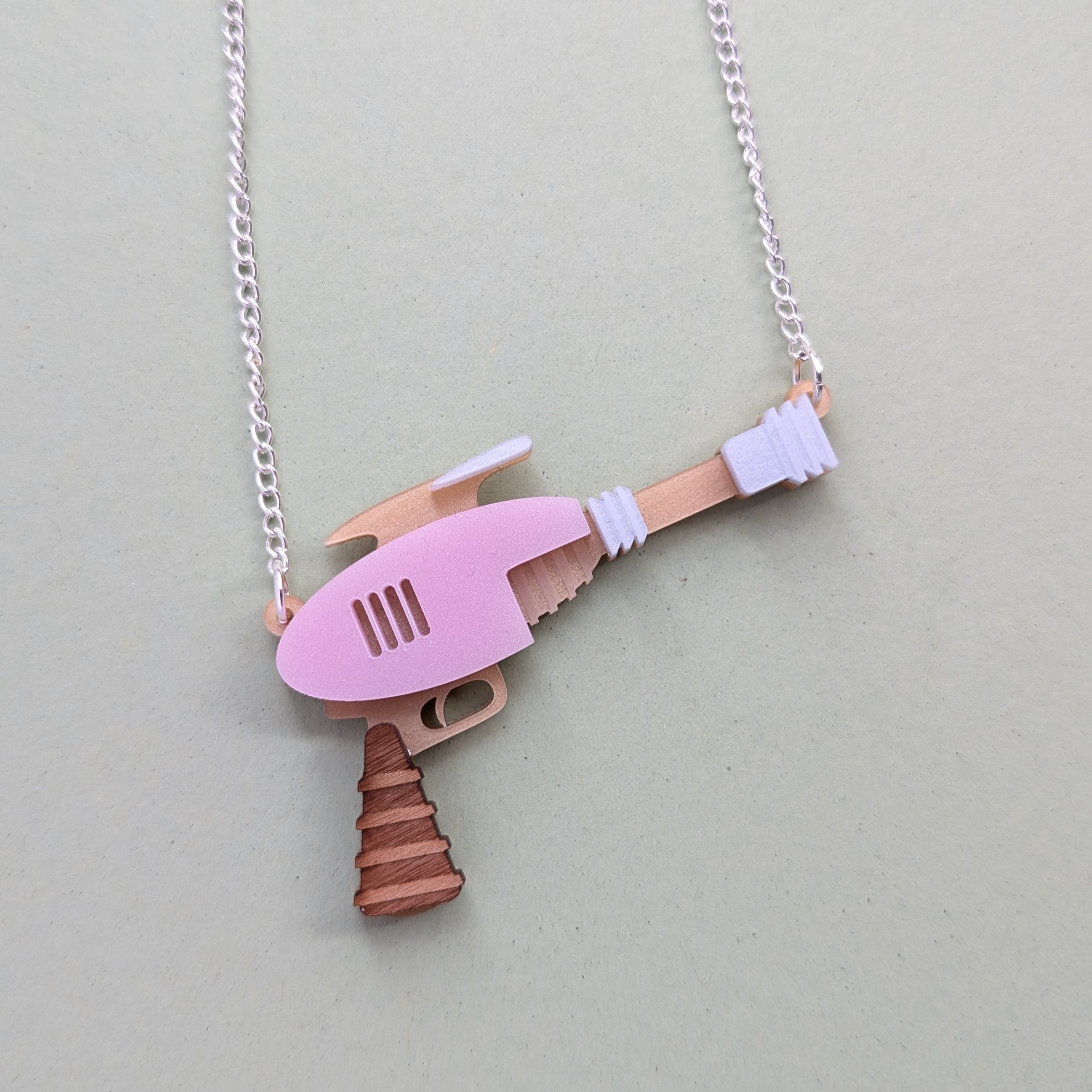 A laser cut acrylic pendant, measuring 70mm wide and hanging from an 18" silver plated chain.