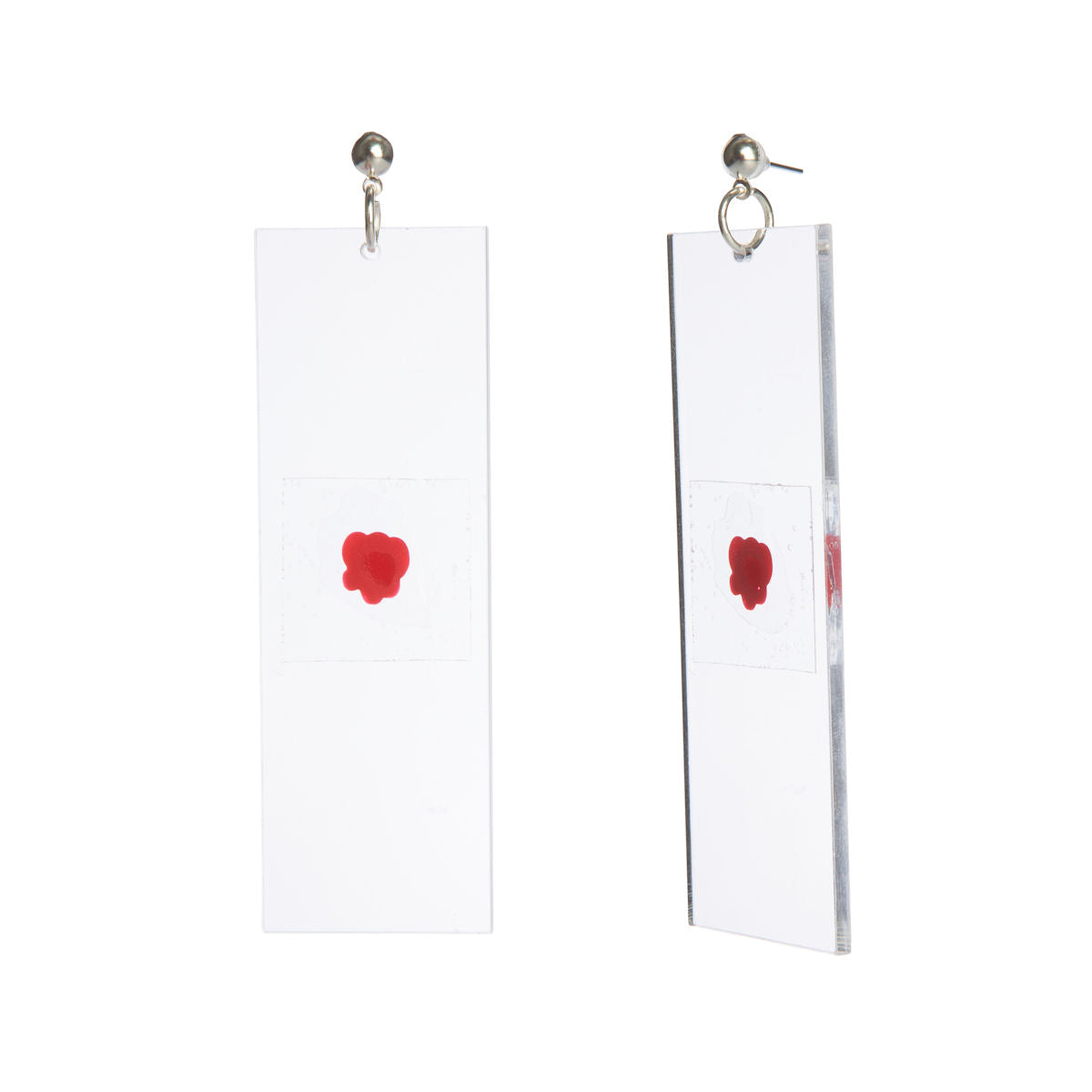 Our Blood Slides are made from transparent laser cut acrylic, with a unique blood spot, finished off with a square of actual acetate, just like the real thing! Each one measures 70mm tall and hangs from a silver plated earring post.