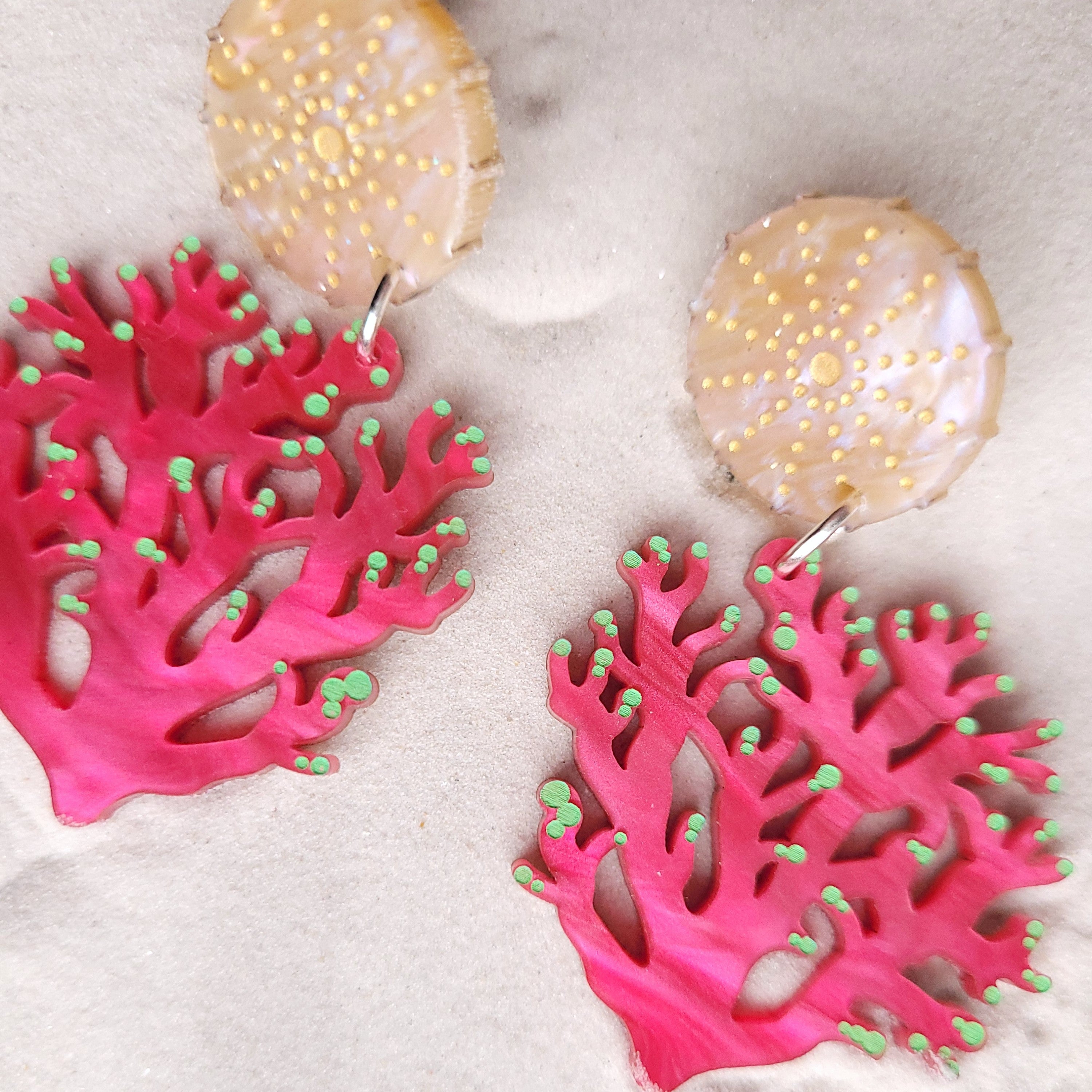 These Coral statement earrings feature a 20mm round sea urchin stud, with a hot pink marbled laser cut acrylic 37mm tall seaweed charm hanging from it. They're hand-inked and feature a plated metal post with hypoallergenic stopper on the back.