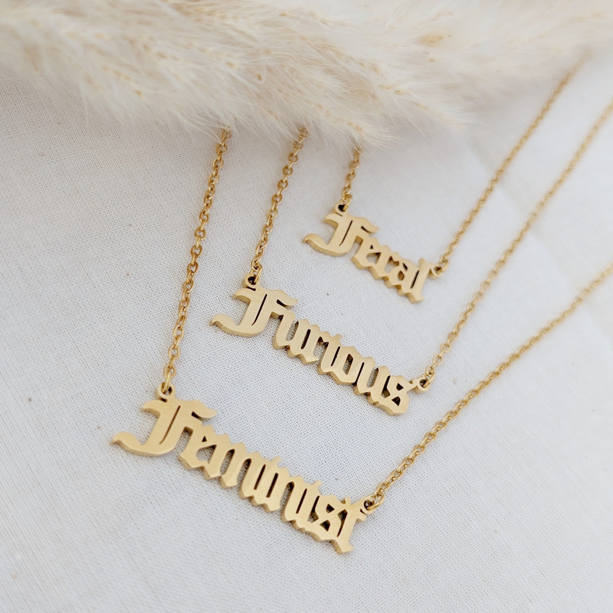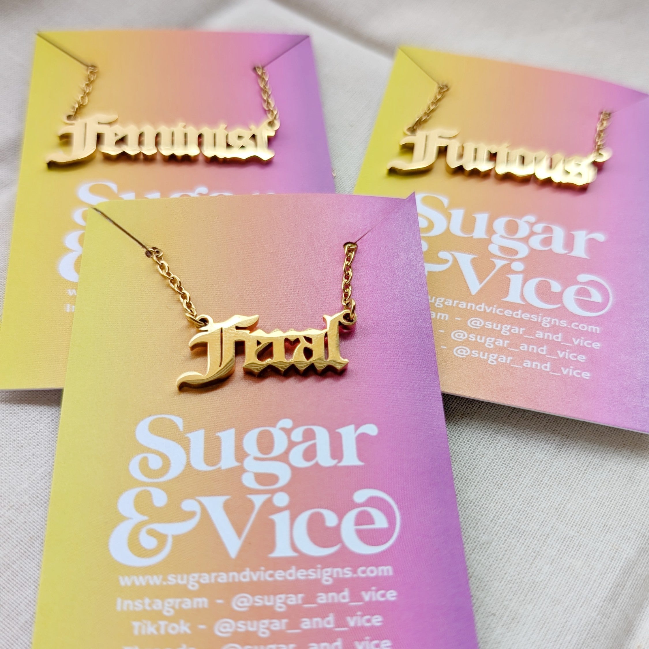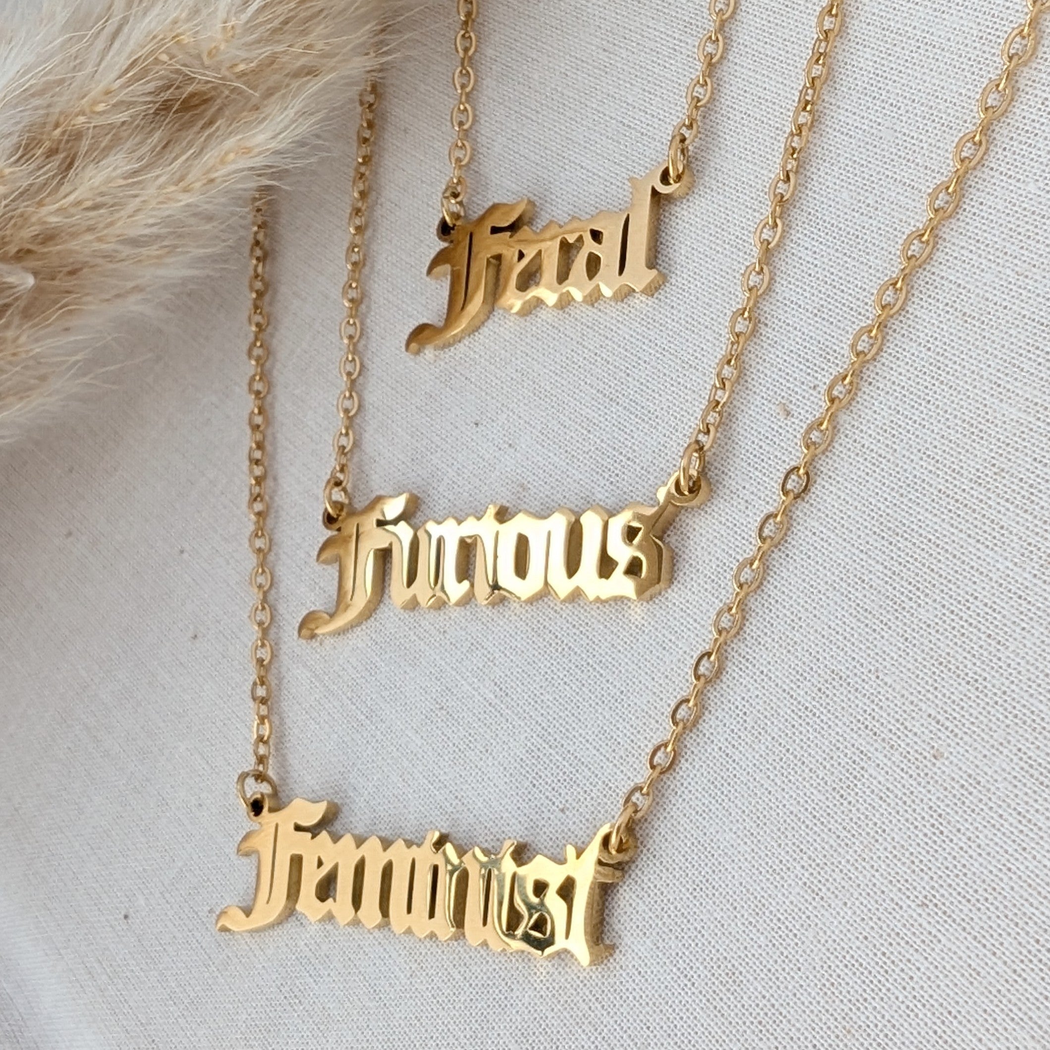 Our petite F word necklaces are made from gold plated stainless steel and hang from 18" gold plated stainless steel chains. Choose from "Feral", "Furious" or "Feminist".
