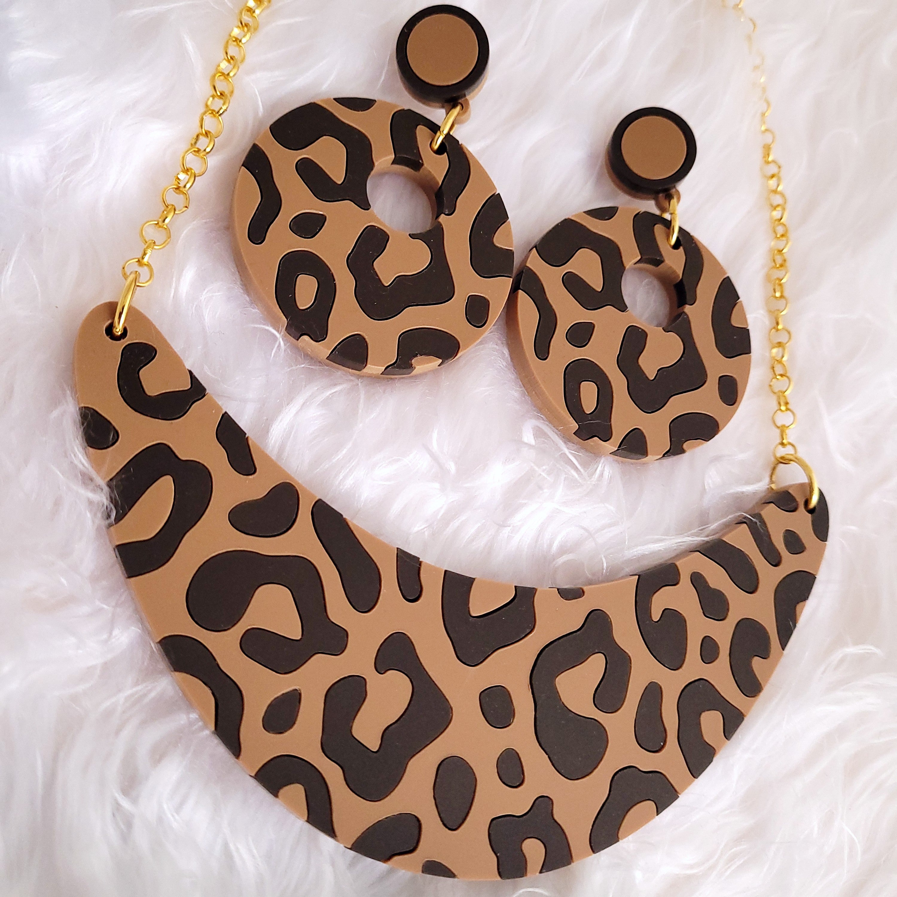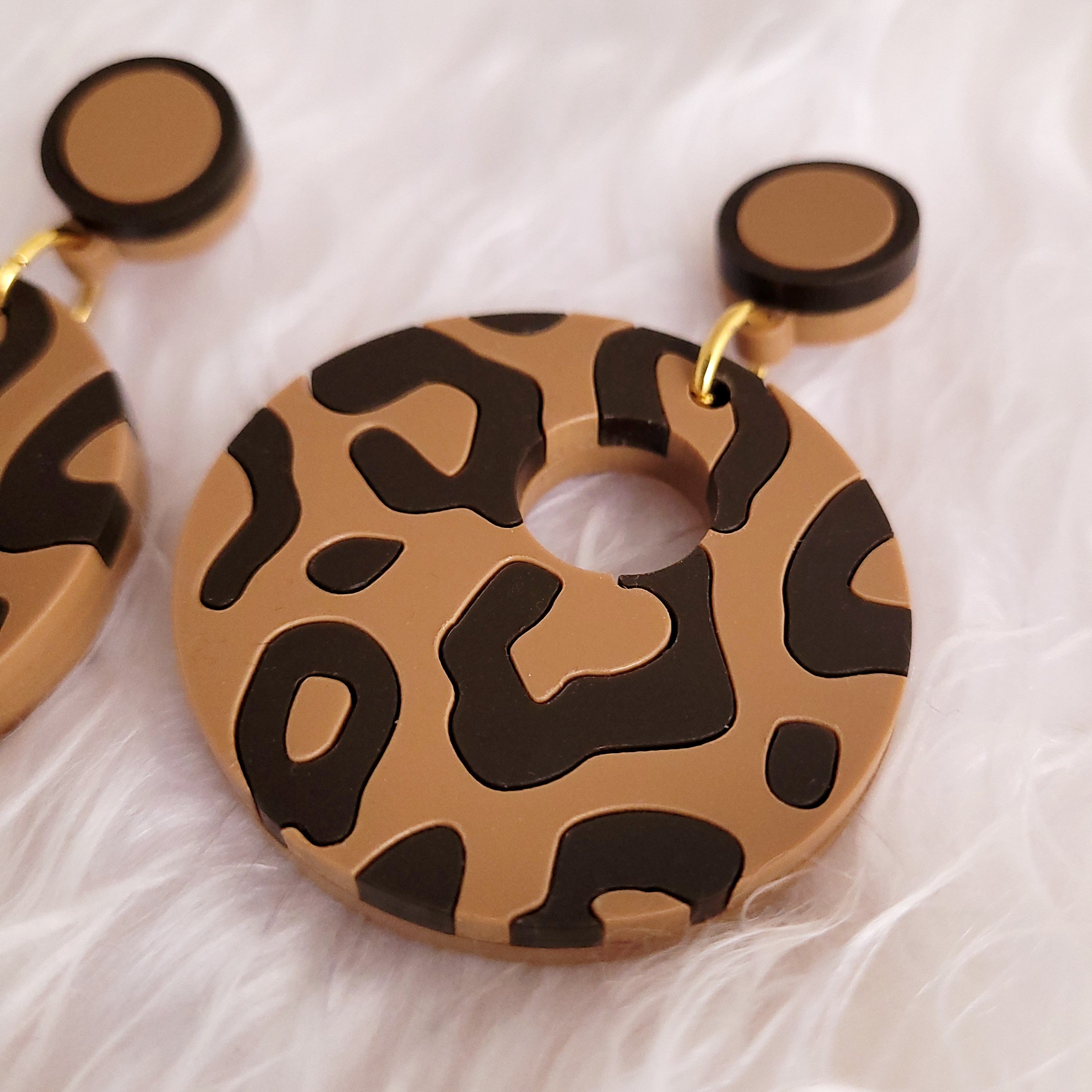 These natural leopard print earrings are a true statement piece. The larger charm measures 50mm and is made from hand-assembled, laser cut acrylic in matte brown shades. They're finished with a circular pad that features a gold plated earring post and hypoallergenic scroll.